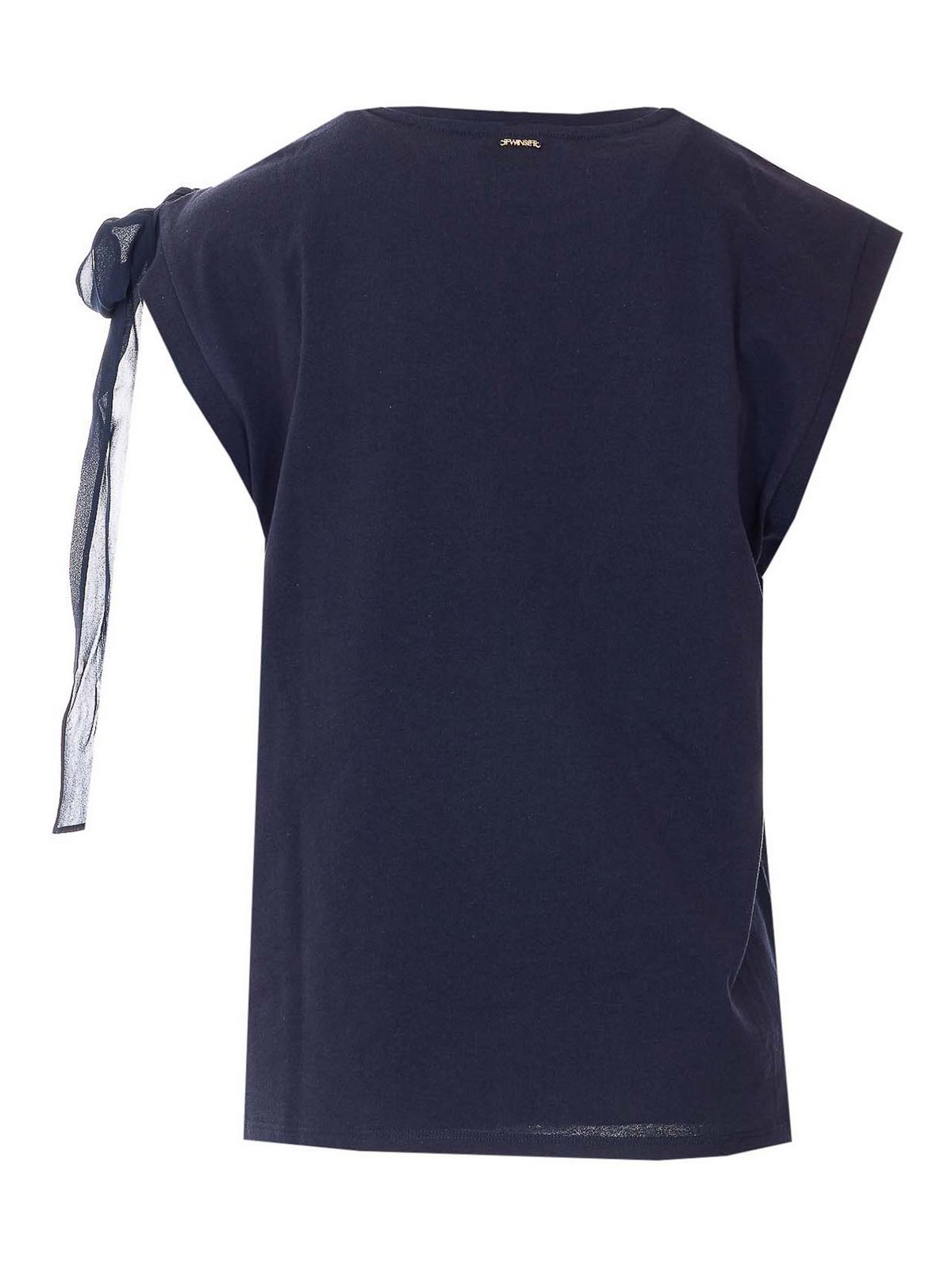 T-shirt blu Twinset, girocollo, girocollo, senza maniche, dettaglio fiocco sulle maniche