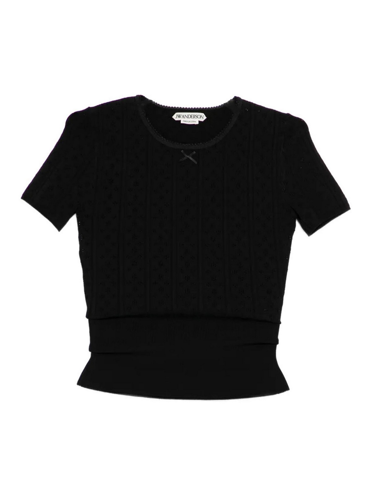 Girocollo, maniche corte, maglia pointelle, dettaglio fiocco, finiture a costine.