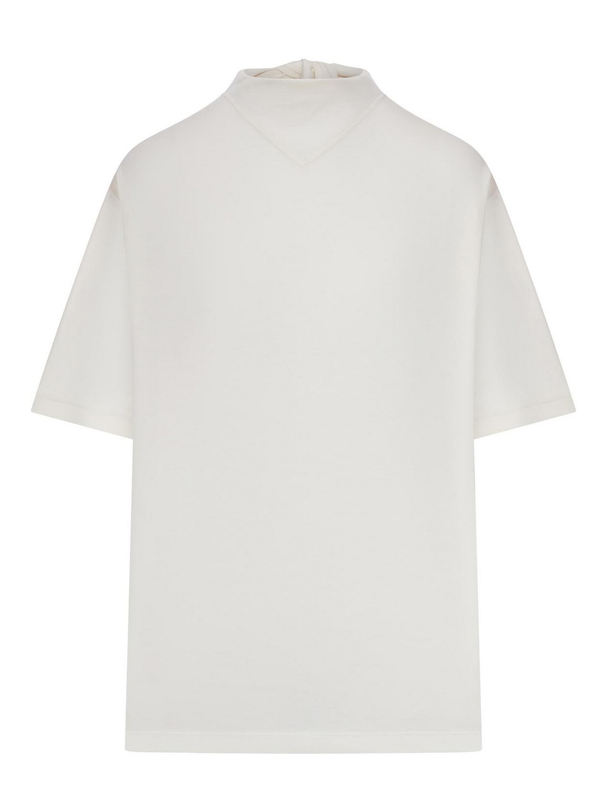T-shirt con sciarpa in jersey mercerizzato, vestibilità boxy, maniche corte, sciarpa attaccata al collo alto, dettagli cuciture sull'orlo e sul colletto, orlo dritto, 100% cotone, colore: panna chiaro