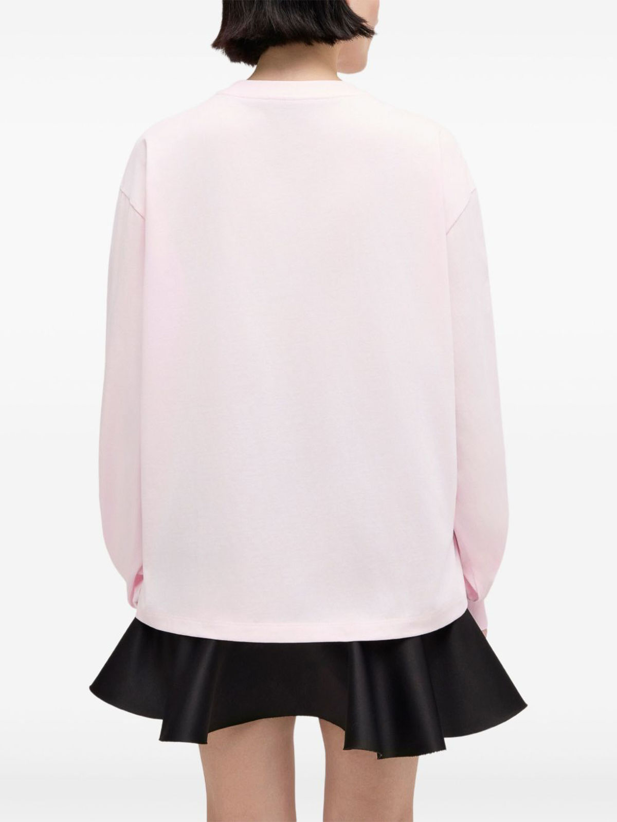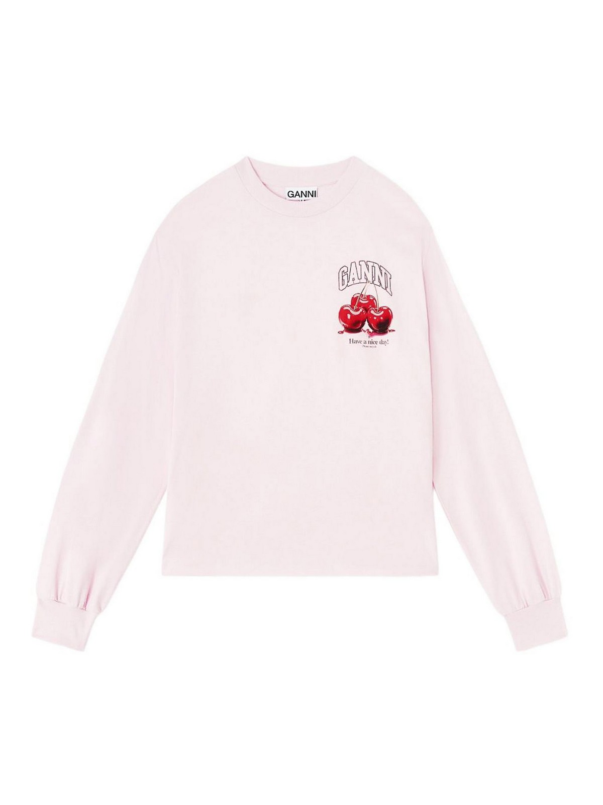 T-shirt con stampa grafica rosa chiaro in cotone di Ganni con maniche lunghe e classico scollo rotondo. Realizzata in cotone morbido e traspirante, questa t-shirt unisce comfort casual e stile straordinario grazie al suo design grafico unico. perfetto per elevare i look di tutti i giorni, si abbina magnificamente con jeans, gonne o indossato sotto capi sartoriali per un guardaroba moderno e femminile