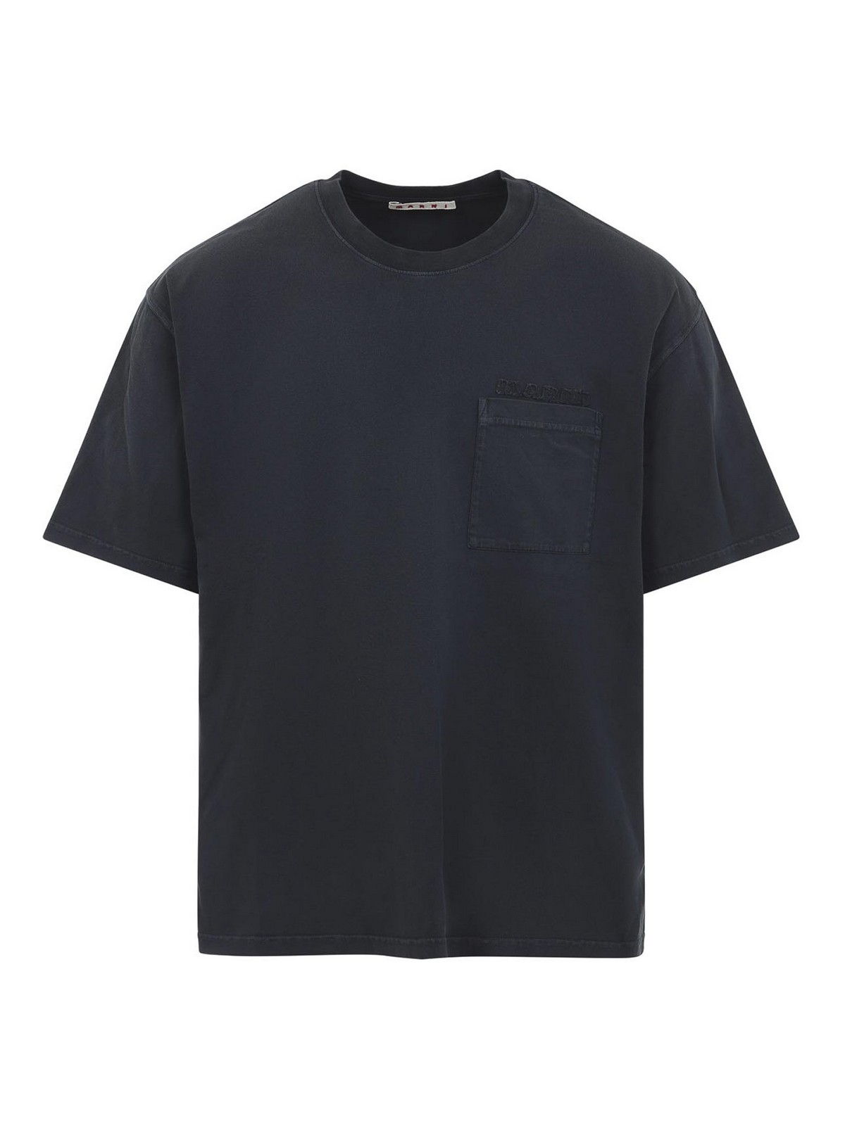 T-shirt Marni in cotone nero. realizzato in cotone nero sbiadito, presenta uno scollo rotondo a costine, un logo ricamato tono su tono e una tasca applicata sul petto, spalle scese, maniche corte e una vestibilità comoda.