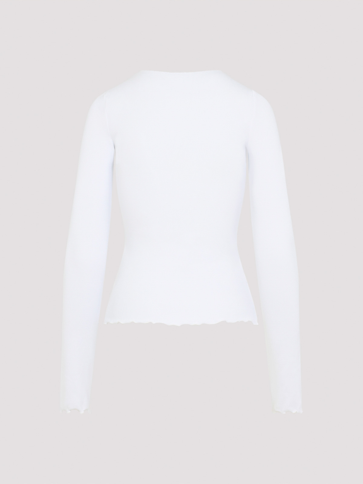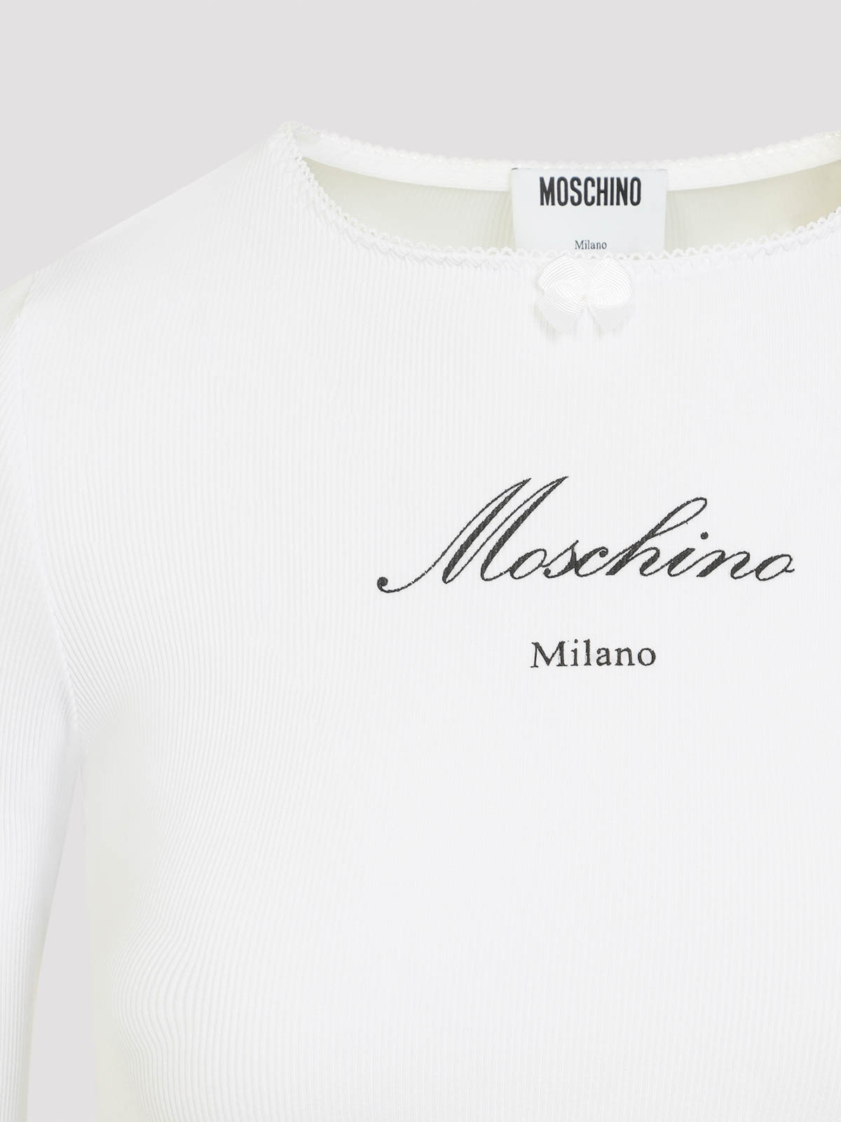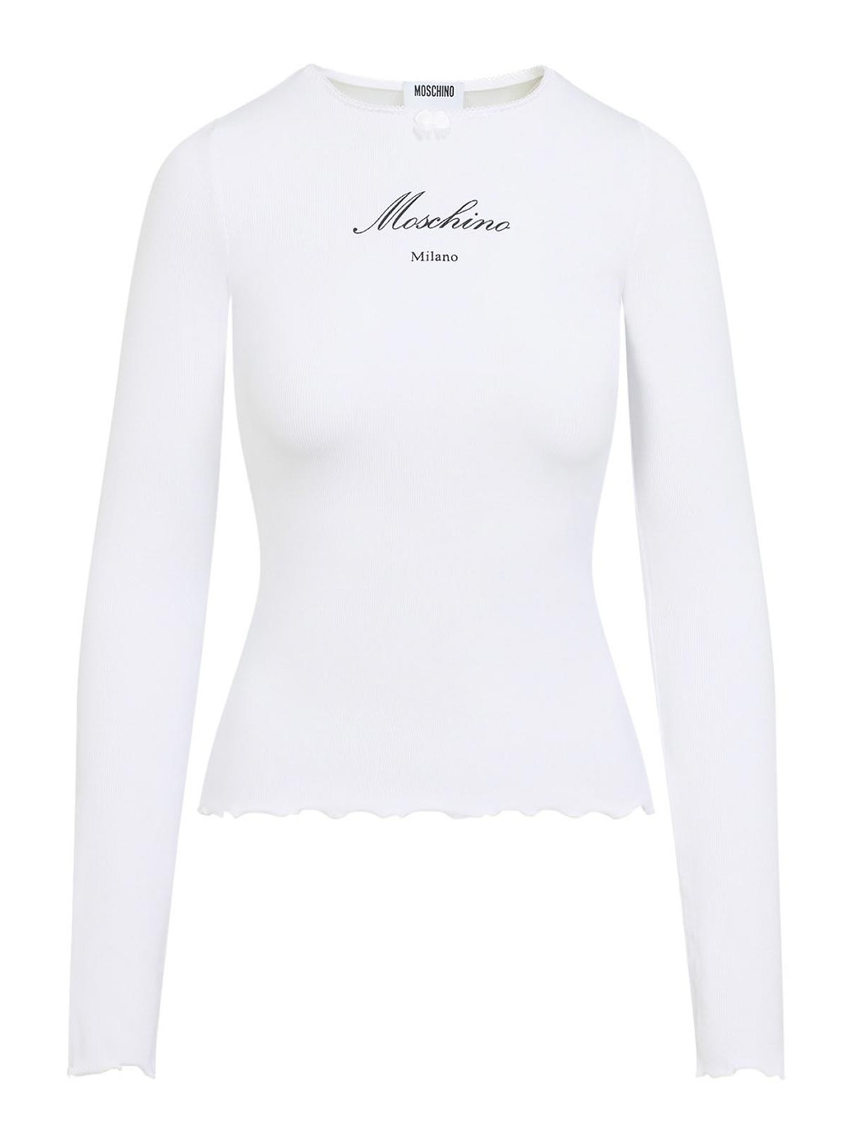 T-shirt Moschino ls in cotone bianco. T-shirt a maniche lunghe realizzata in cotone stretch bianco a coste, caratterizzata da colletto tondo con bordo smerlato, dettaglio mini fiocco frontale, logo nero a contrasto sul petto, polsini e fondo con volant e vestibilità slim.