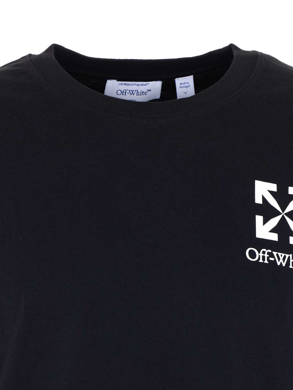 T-shirt Off White nera con piccola freccia, girocollo, stampa sul davanti