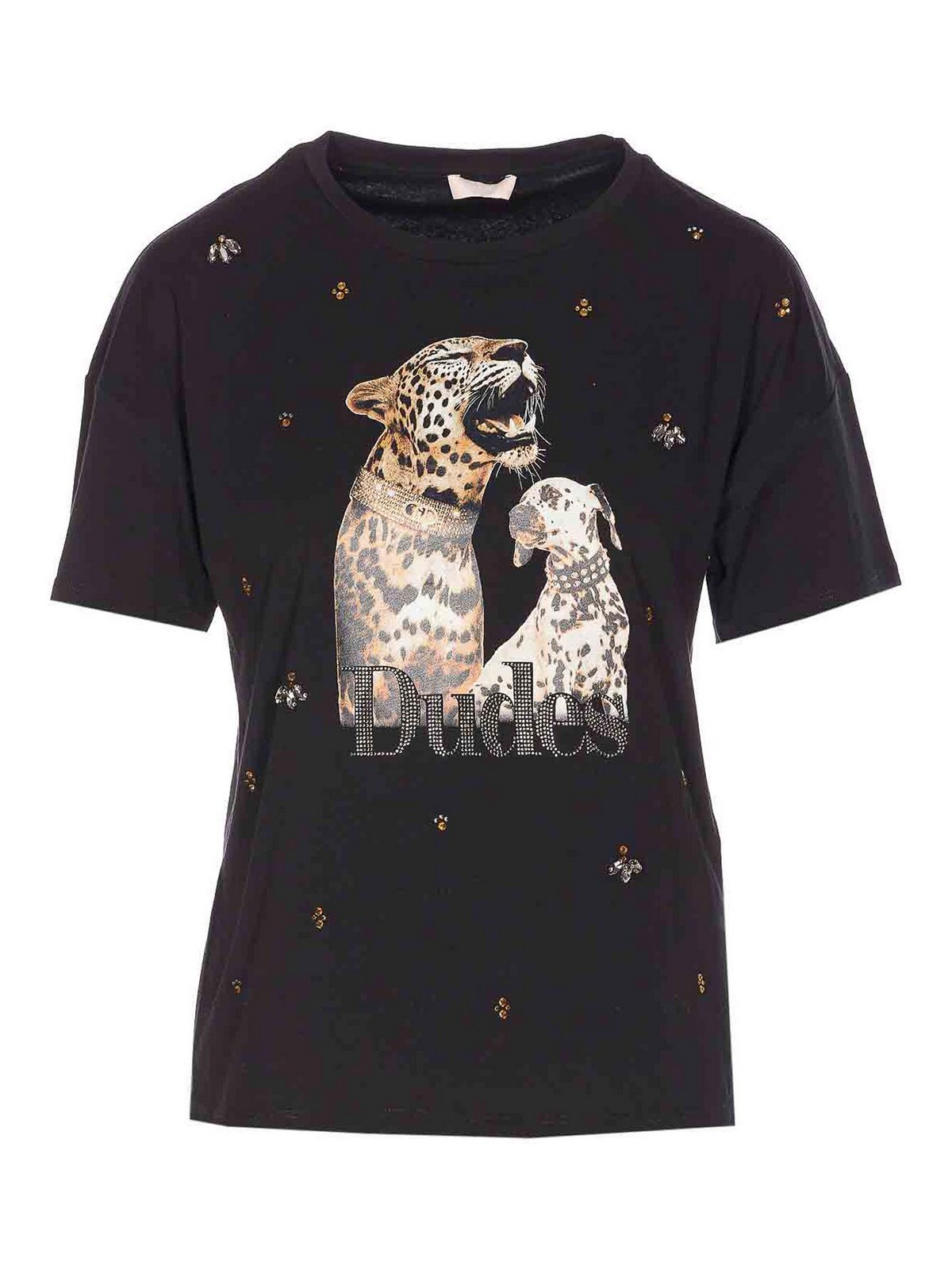T-shirt Liu jo nera, girocollo, stampa sul davanti, dettagli in strass all over