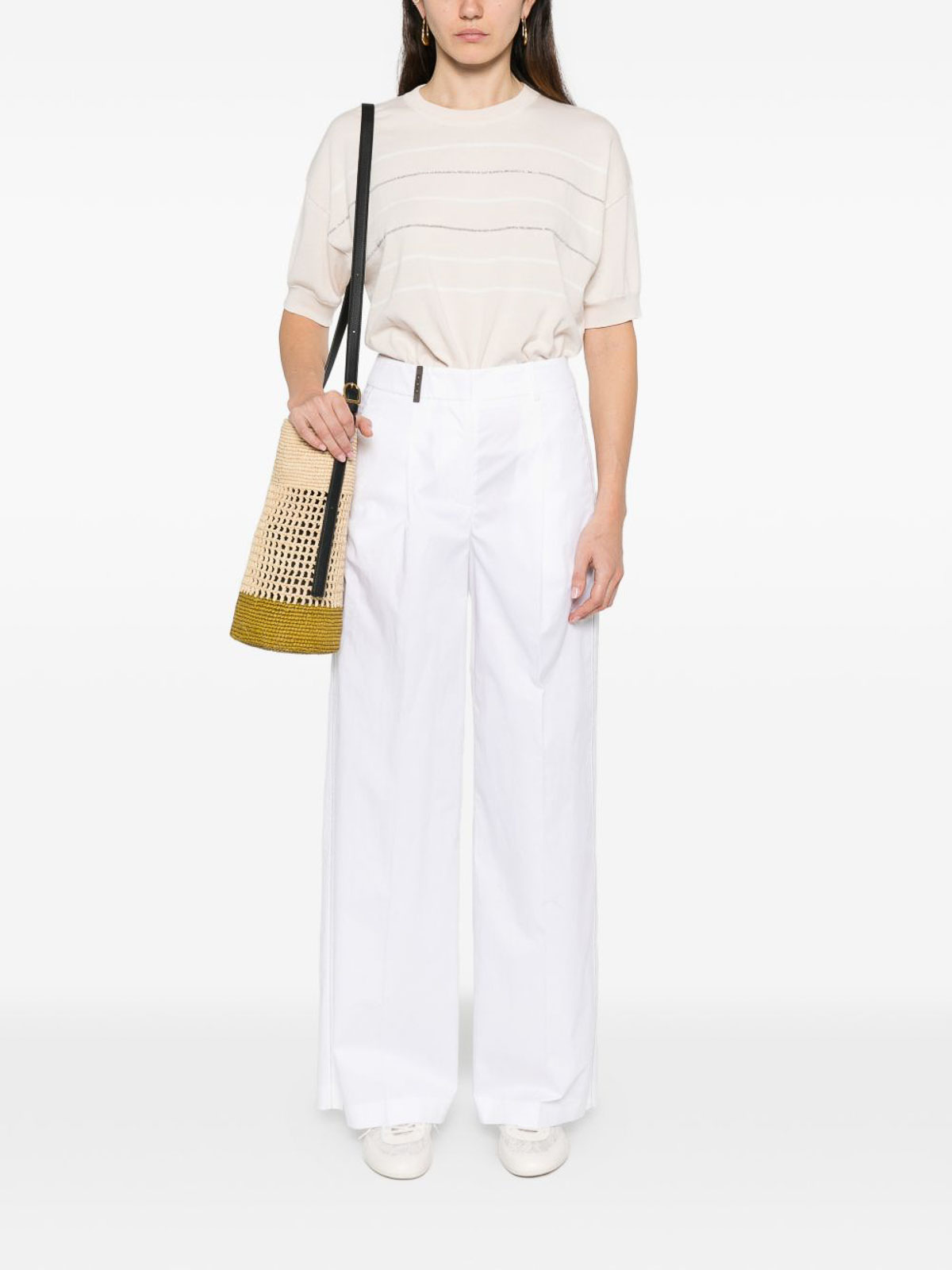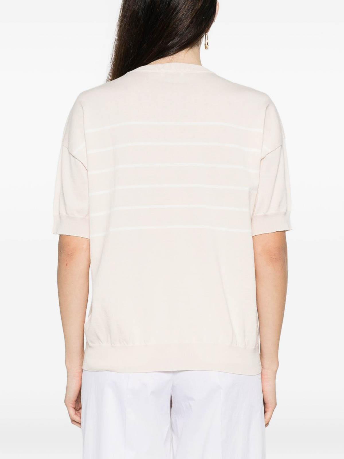Maniche corte a righe beige, girocollo, orlo a coste, polsini a coste