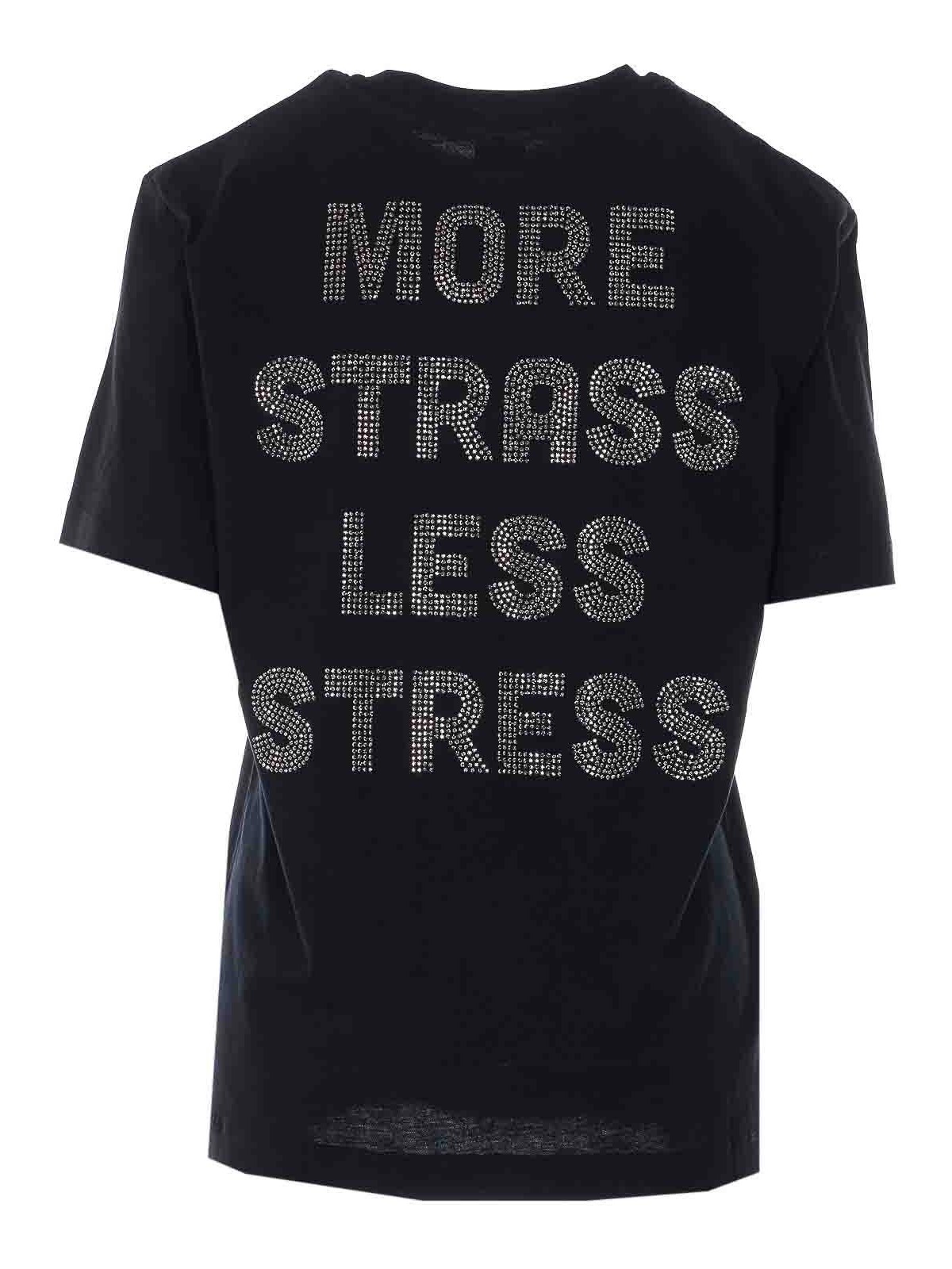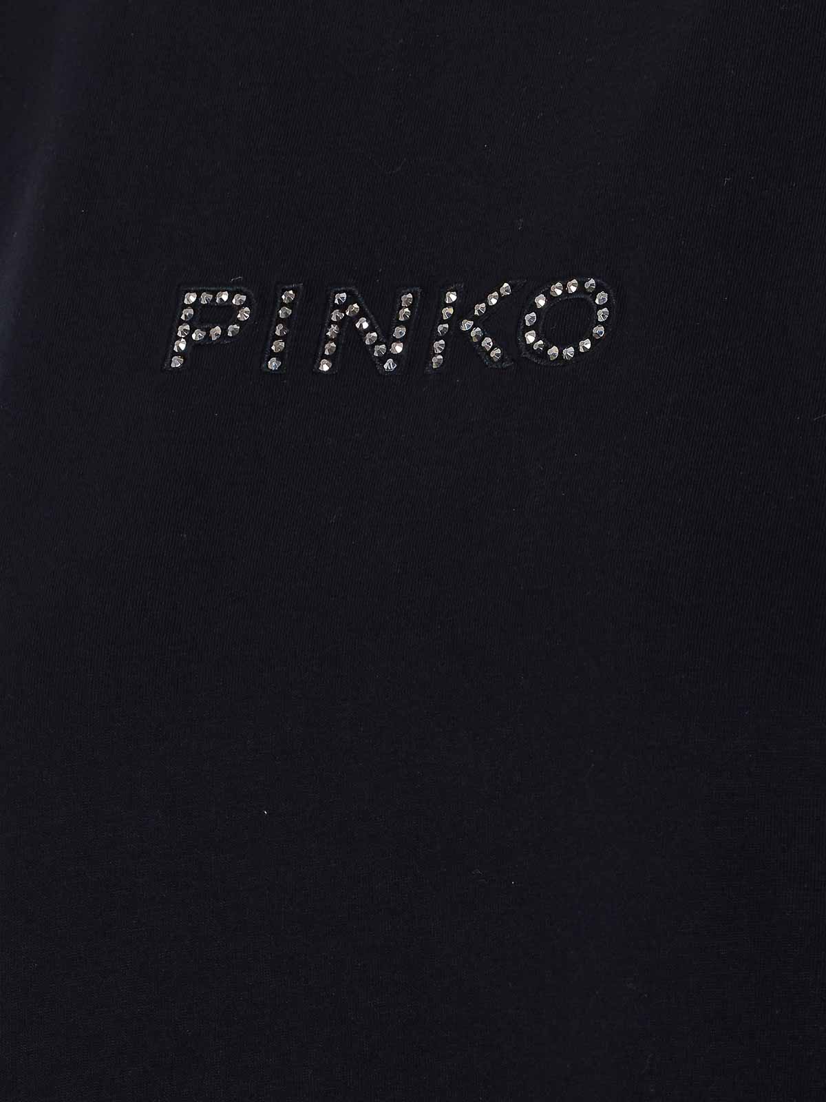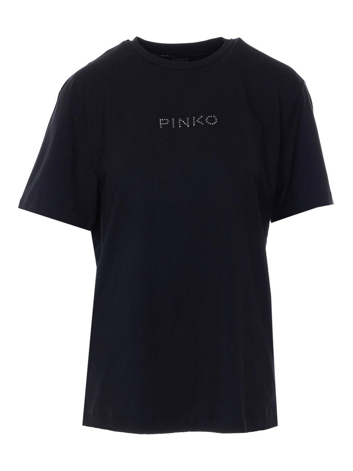 T-shirt Pinko stepitoso nera, girocollo, dettaglio strass sul retro, logo strass sul davanti
