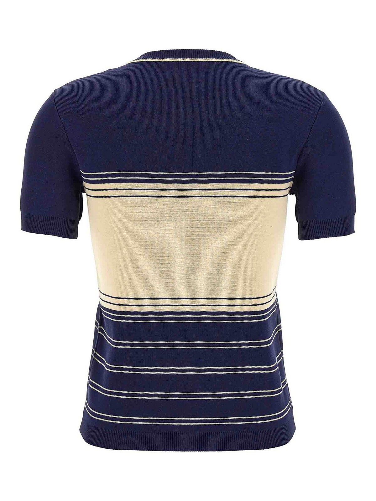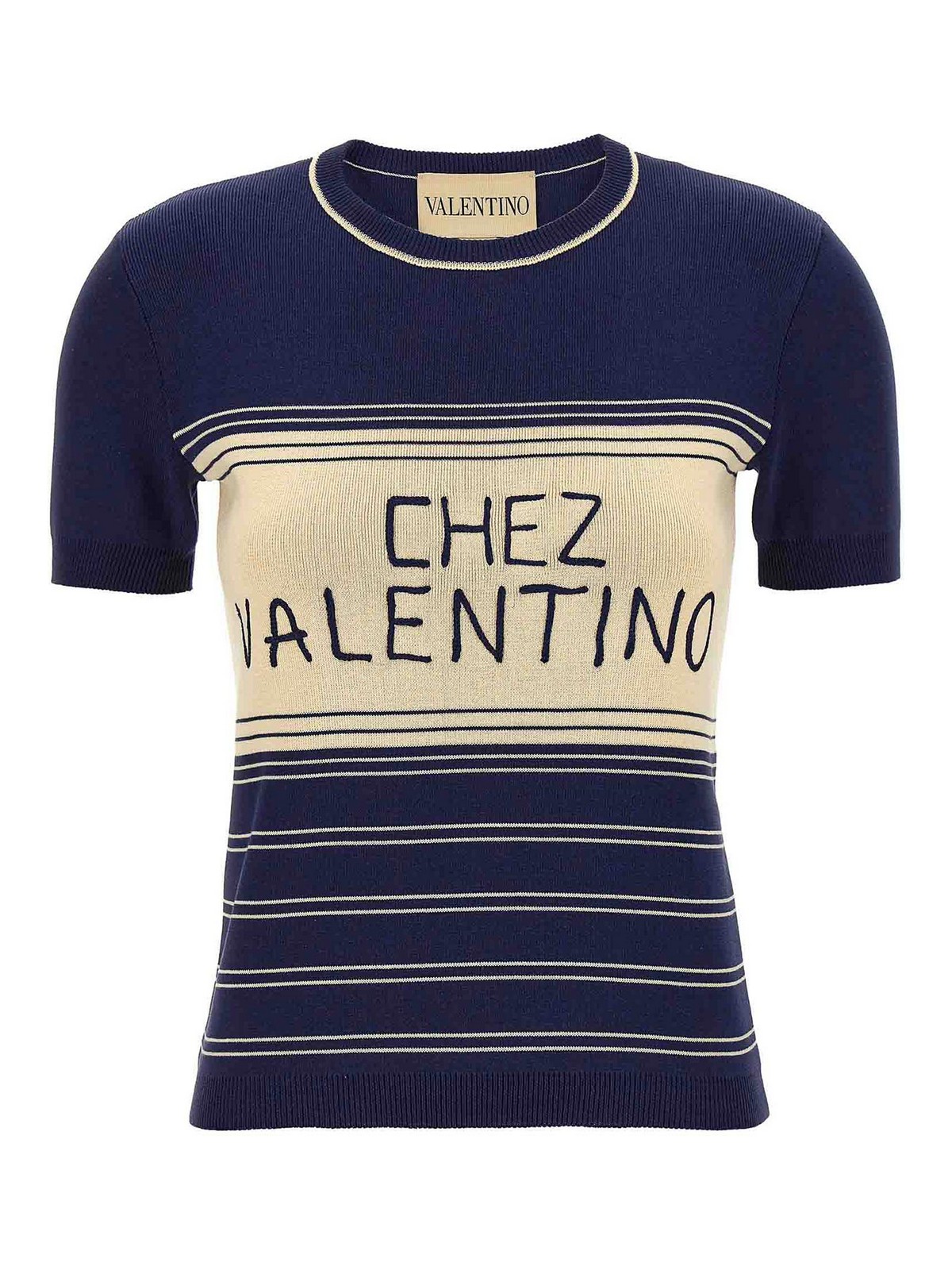 T-shirt in maglia di cotone con righe jacquard, ricamo 'chez valentino' davanti, girocollo, maniche corte.