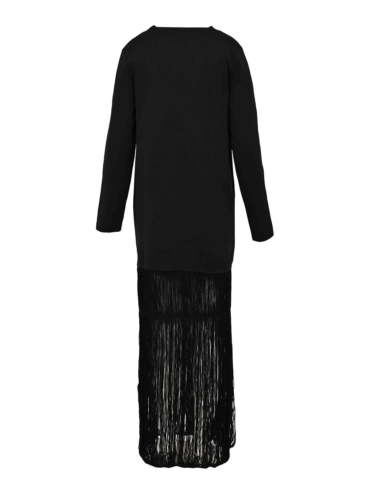 Abito lungo da donna in crepe con frange, liviana conti, tessuto: crepe, fantasia: tinta unita nera, maniche: lunghe, collo: scollo a v, chiusura: nessuna, modello da indossare, tasche: assenti, dettagli: parte superiore in tessuto liscio, parte inferiore con frange lunghe, effetto trasparenza al fondo, linea fluida e moderna, foderato: no, vestibilità: regolare