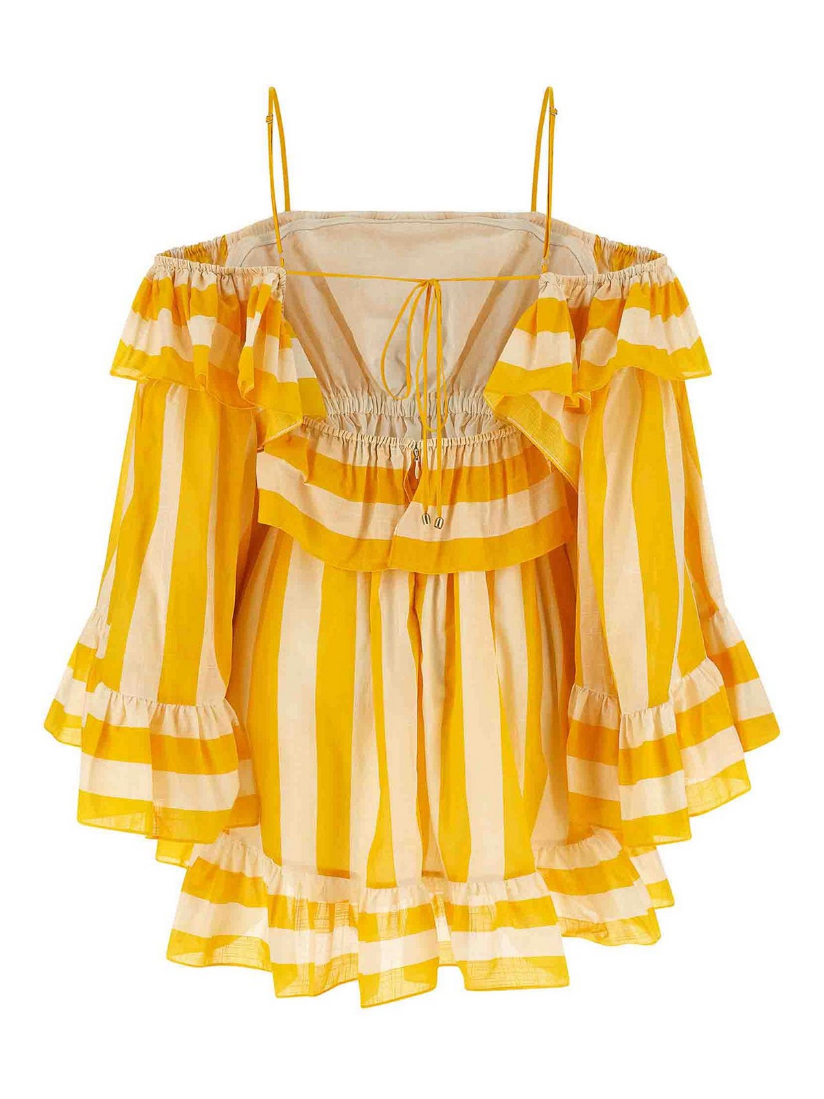 Vestito arricciato in cotone a righe 'daylight', modello spalle scoperte con volant ed elastico nella parte Top , spalline sottili regolabili che possono essere nascoste all'interno dell'Vestito , ampio scollo posteriore con cinturino da annodare, maniche lunghe ampie con volant ai polsi, chiusura posteriore con zip, balza al fondo, cintura removibile. Cintura ovabile.