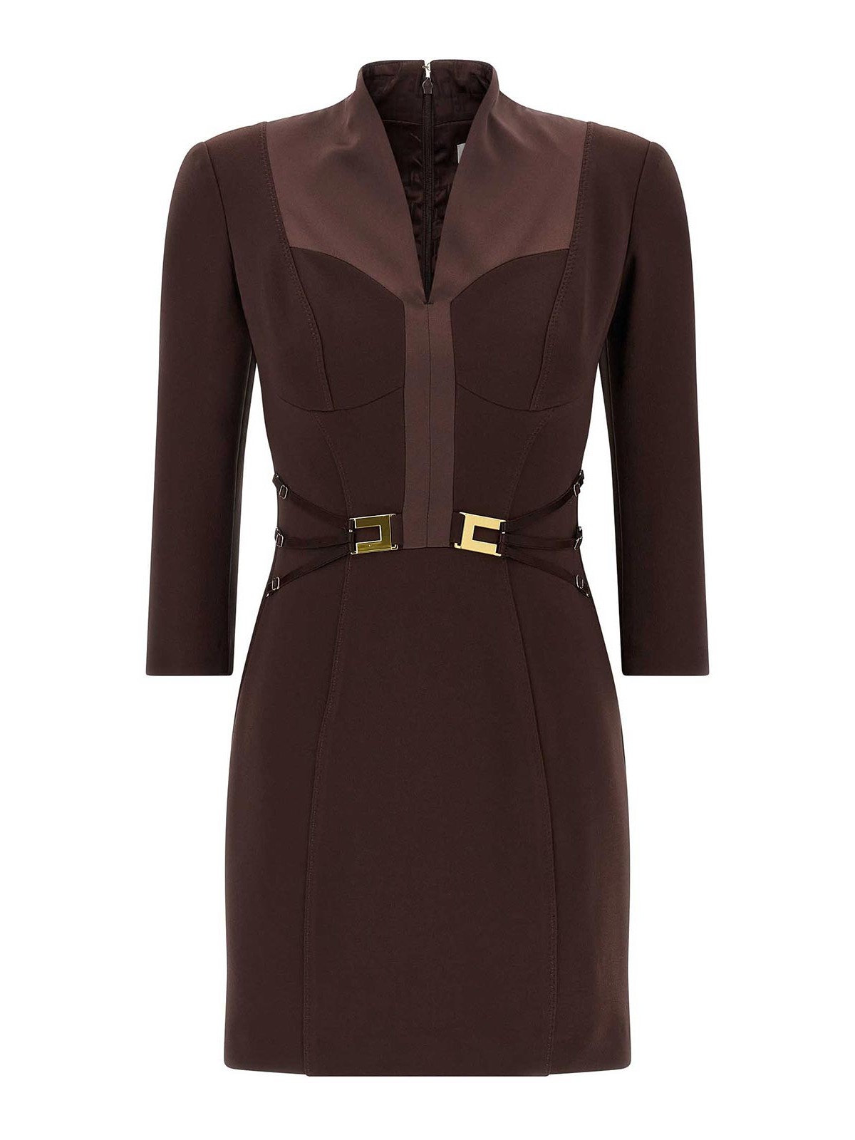Mini Vestito in double crpe stretch, dettaglio logo in metallo con elastici regolabili in vita, modello d'ispirazione corsetteria con coppe frontali e cuciture a zig zag, attacco a V in raso tono su tono, spalline strutturate, maniche a 3/4, chiusura posteriore con zip, fodera in raso monogram.