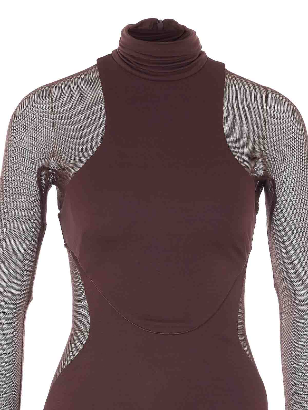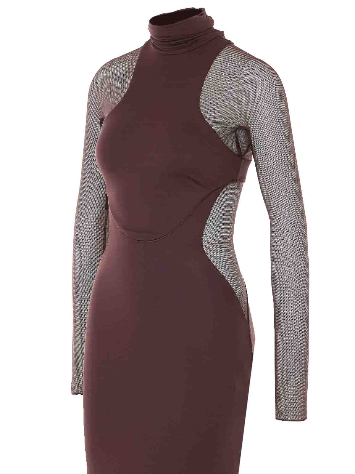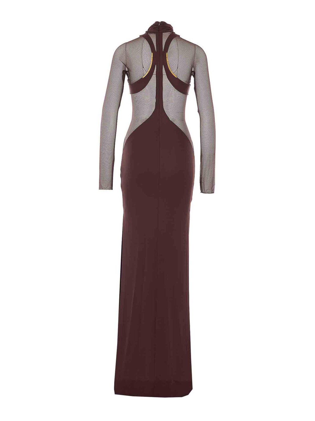 Vestito da red carpet marrone Elisabetta franchi, collo alto, maniche trasparenti, vestibilità elasticizzata, modello lungo