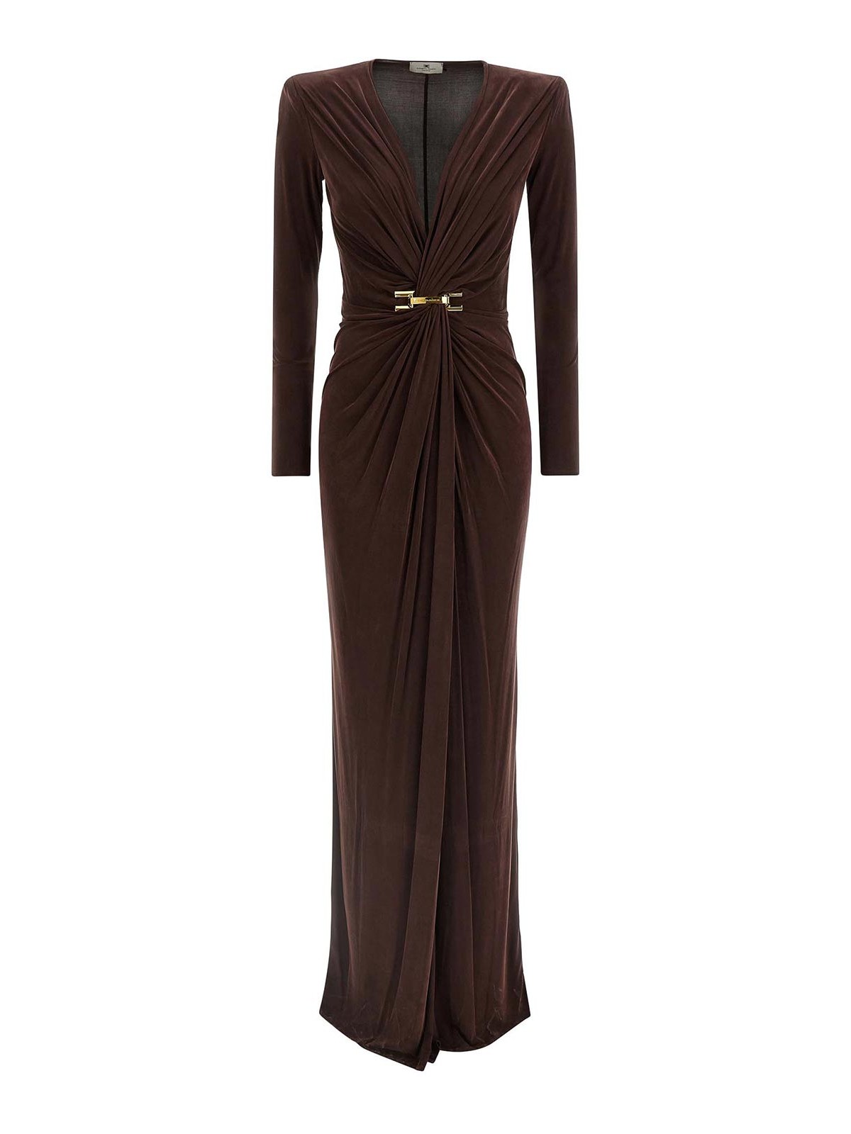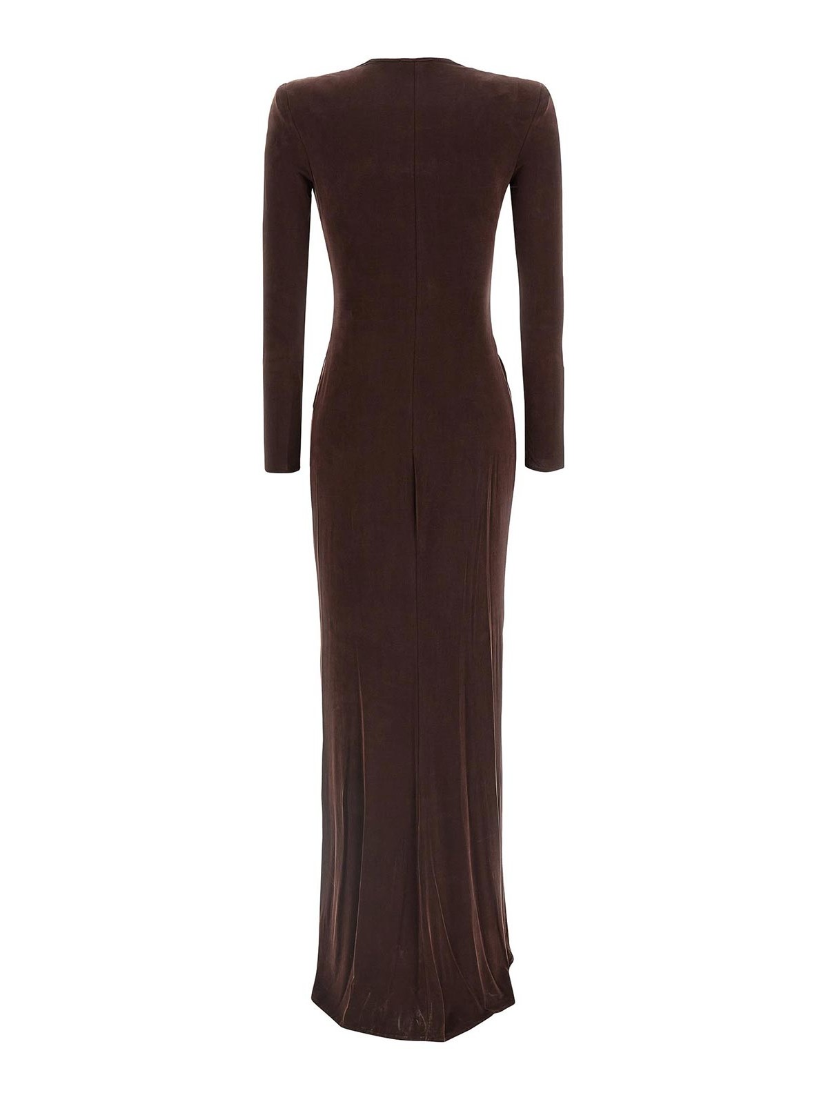 Vestito lungo 'red carpet' in jersey di cupro con ampio scollo a V davanti con drappeggio, arricciatura e logo gioiello con strass, spalle imbottite, maniche lunghe, gonna con strascico e ampio spacco davanti.