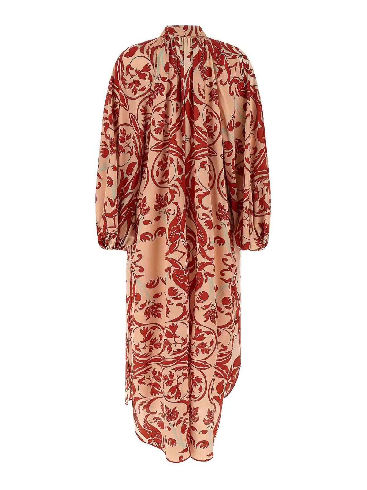 Maxi Vestito 'europa' in crepe de chine di seta all over con stampa 'braquemetry', modello chemisier, profili in raso tinta unita, chiusura frontale con bottoni, spacchi laterali, maniche lunghe e ampie a palloncino con polsini elastici.