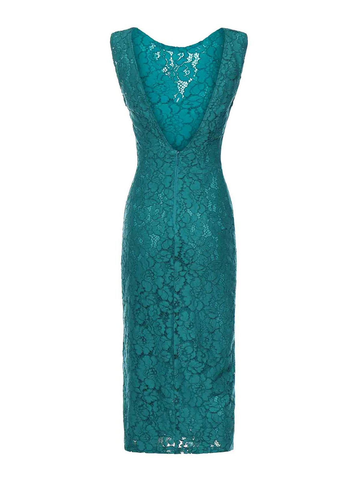 realizzato in pizzo rebrod, senza maniche, spacco laterale davanti, scollatura a v sul retro, la taglia indicata è 38, colore verde