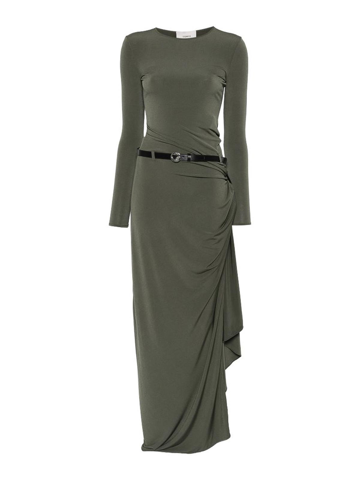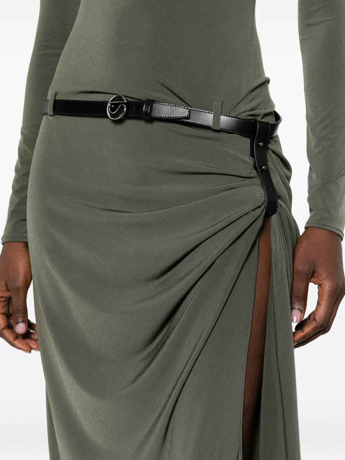 Maxi Vestito drappeggiato in tessuto verde di Coperni caratterizzato da scollo rotondo, maniche lunghe e un elegante dettaglio drappeggiato pensato per valorizzare la silhouette. rifinito con una cintura nera con fibbia logo argento, questo pezzo bilancia la struttura moderna con un minimalismo raffinato. un design esclusivo Coperni, perfetto per uno stile contemporaneo, eventi serali e occasioni speciali elevate.