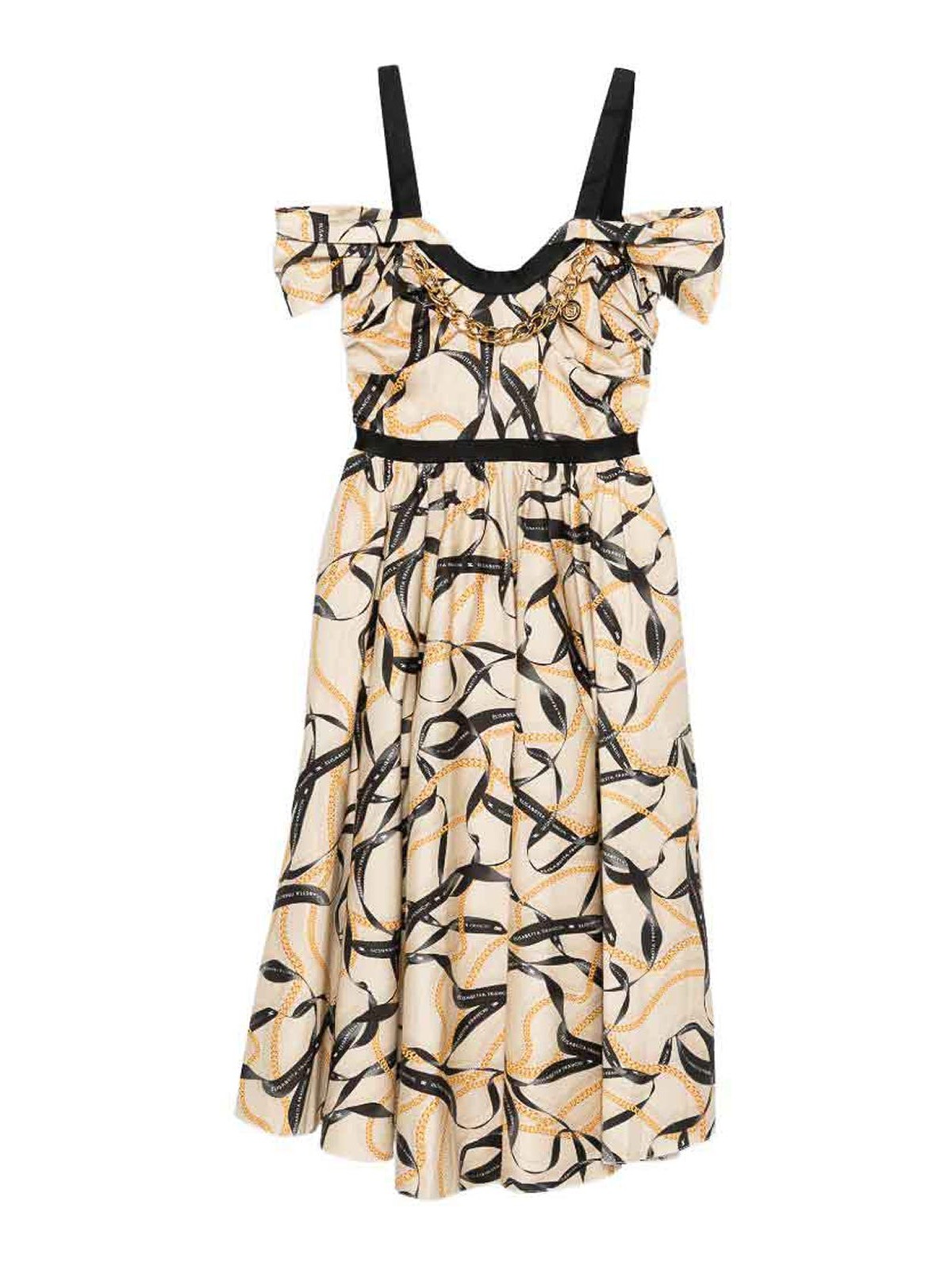 Vestito midi in tessuto panna chiaro di Elisabetta Franchi caratterizzato da stampa di nastri, spalline con dettaglio catena, accenti raccolti e gonna con dettagli volant. la lunghezza midi e la silhouette fluida offrono movimento naturale ed eleganza, perfetta per look estivi, eventi raffinati o sofisticati outfit da giorno. dettagli sartoriali come la balza e la tracolla a catena aggiungono un tocco di stile contemporaneo, rendendo questo Vestito un capo versatile e distintivo.