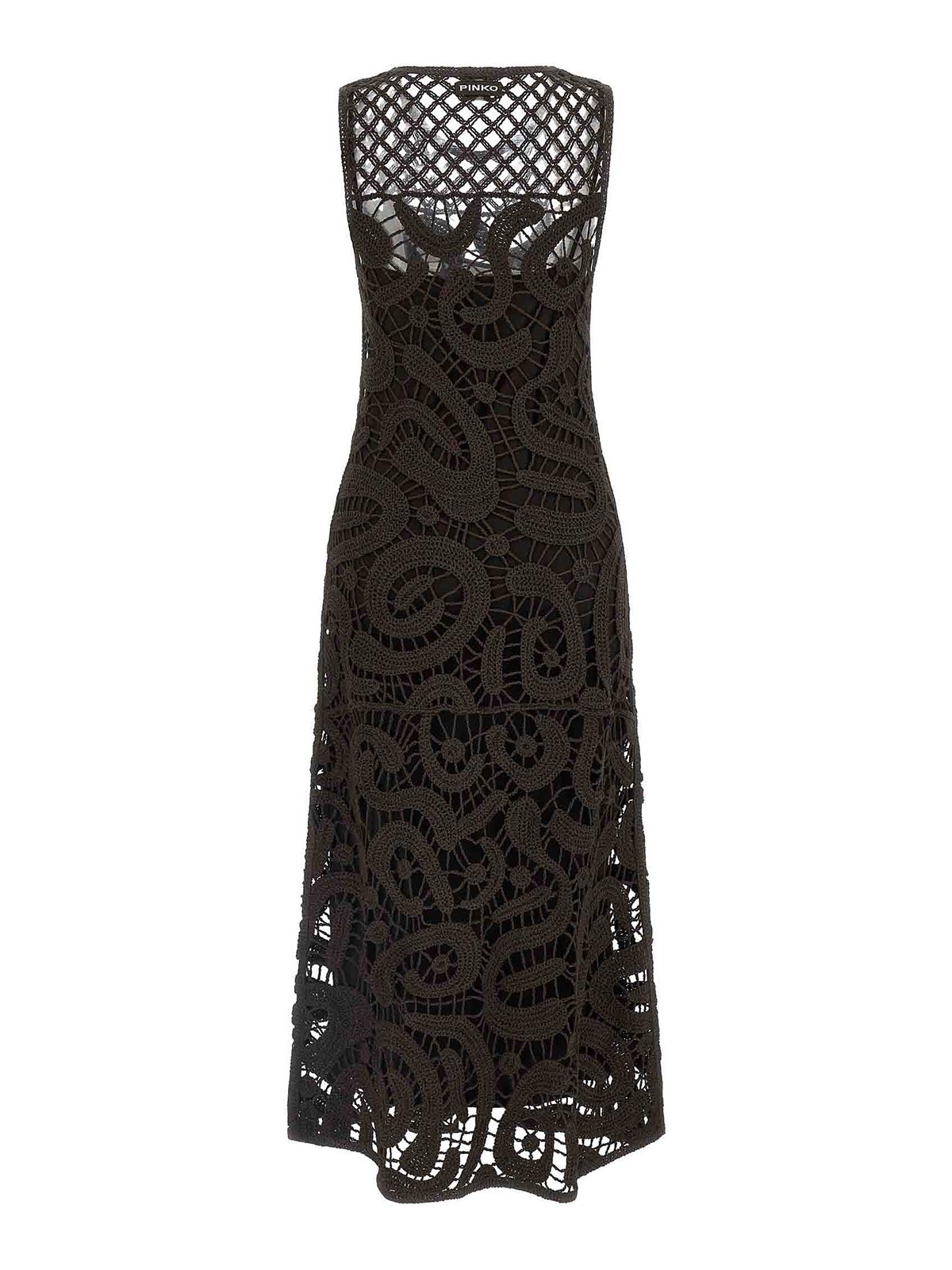 Vestito lungo 'bufera' in viscosa all'uncinetto, girocollo, senza maniche, sottoveste removibile con spalline sottili.
