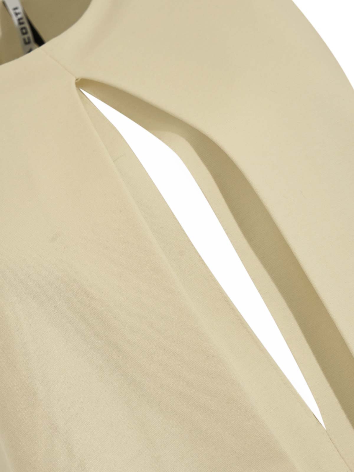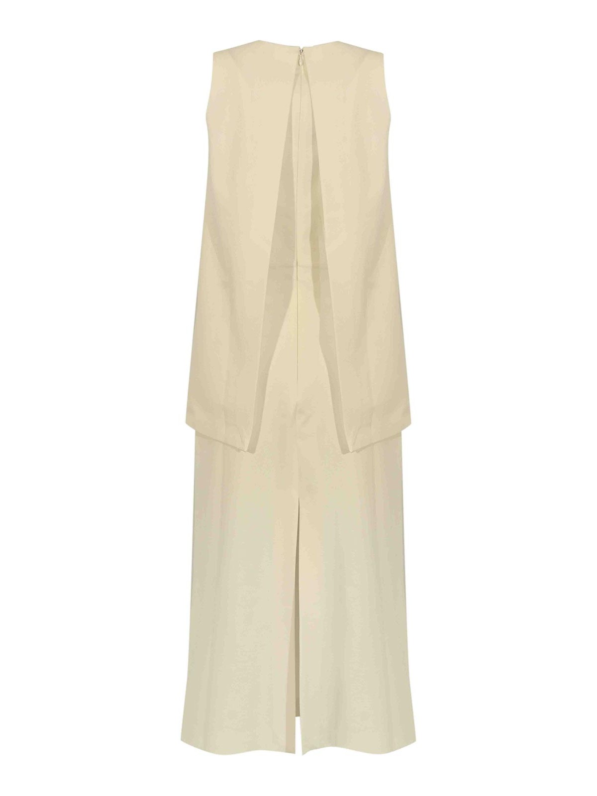 Abito midi smanicato in punto milano di viscosa, liviana conti, tessuto: misto viscosa elasticizzato, fantasia: tinta unita color pomice, maniche: smanicato, collo: tondo con apertura a goccia sul davanti, chiusura: zip posteriore invisibile, tasche: assenti, dettagli: sovrapposizione frontale effetto mantella, spacco posteriore al fondo, linea minimal ed elegante, foderato: no, vestibilità: regolare