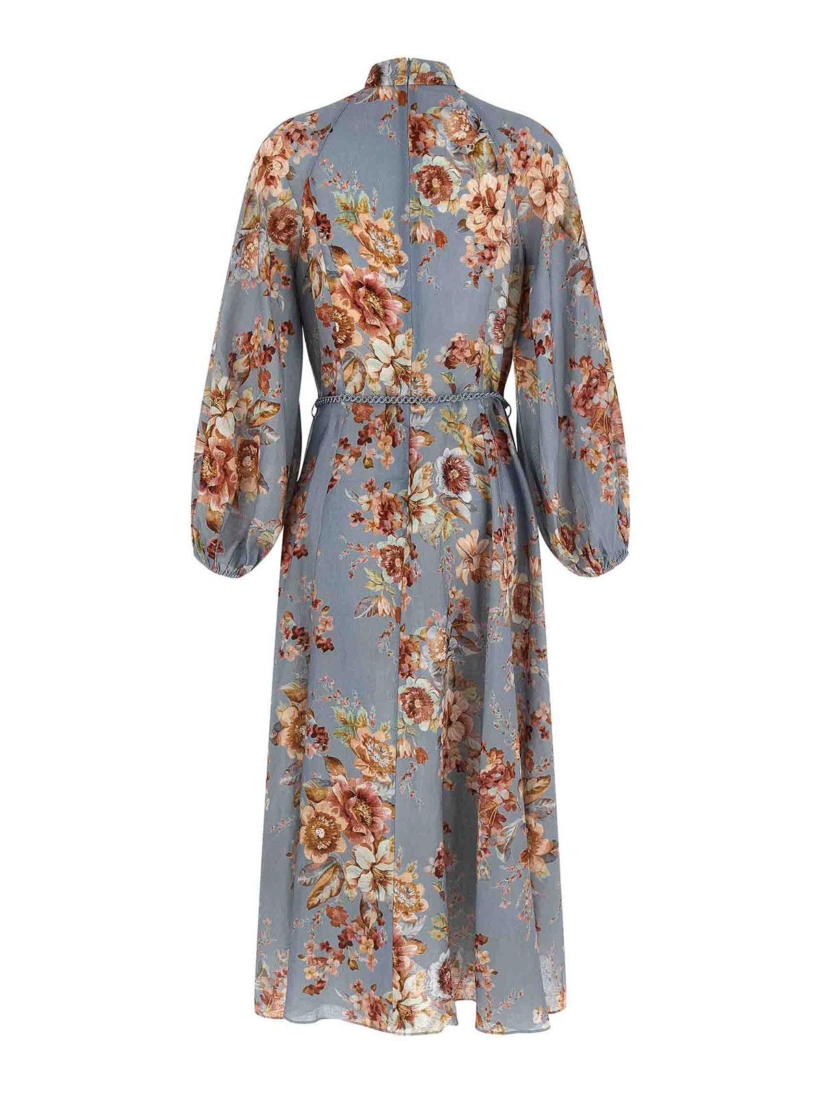 Vestito lungo 'awaken' in lino con stampa floreale dalla silhouette svasata, collo alto, chiusura frontale con bottoni, maniche lunghe a sbuffo con polsini elastici, chiusura posteriore con zip, cintura removibile.
