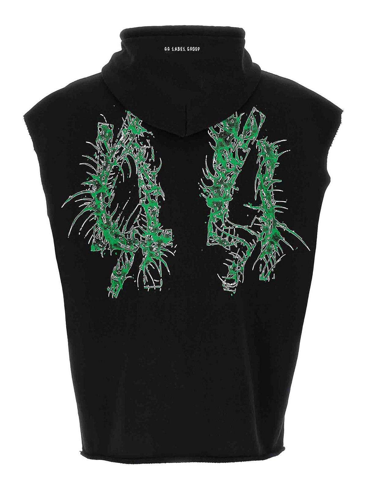 前面と背面にプリントが施されたムカデガーゼコットンパーカー、カンガルートロンプルイユポケット、ノースリーブ、ローカットヘム。