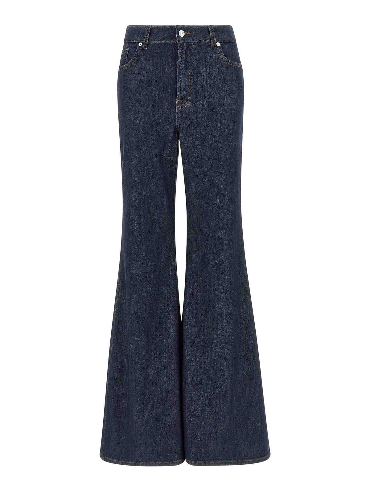コントラストステッチのレトロフレアストレッチコットンデニムジーンズ、ハイウエスト、フレアフィットのワイドレッグ、ジッパーとフロントボタンクロージャー、ポケット5つ。