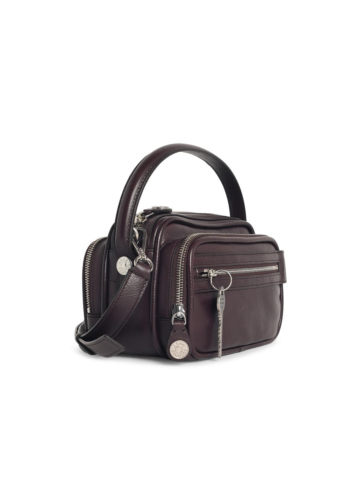 ティアドロップハンドルと調節可能なショルダーストラップ、シルバージッパーコンパートメントとデニムスタイルのボタンディテール、ロゴキーペンダント、シルバーフィルム付きエンボス加工の「Acne studios」ロゴ 20 x 12 x 11 cm