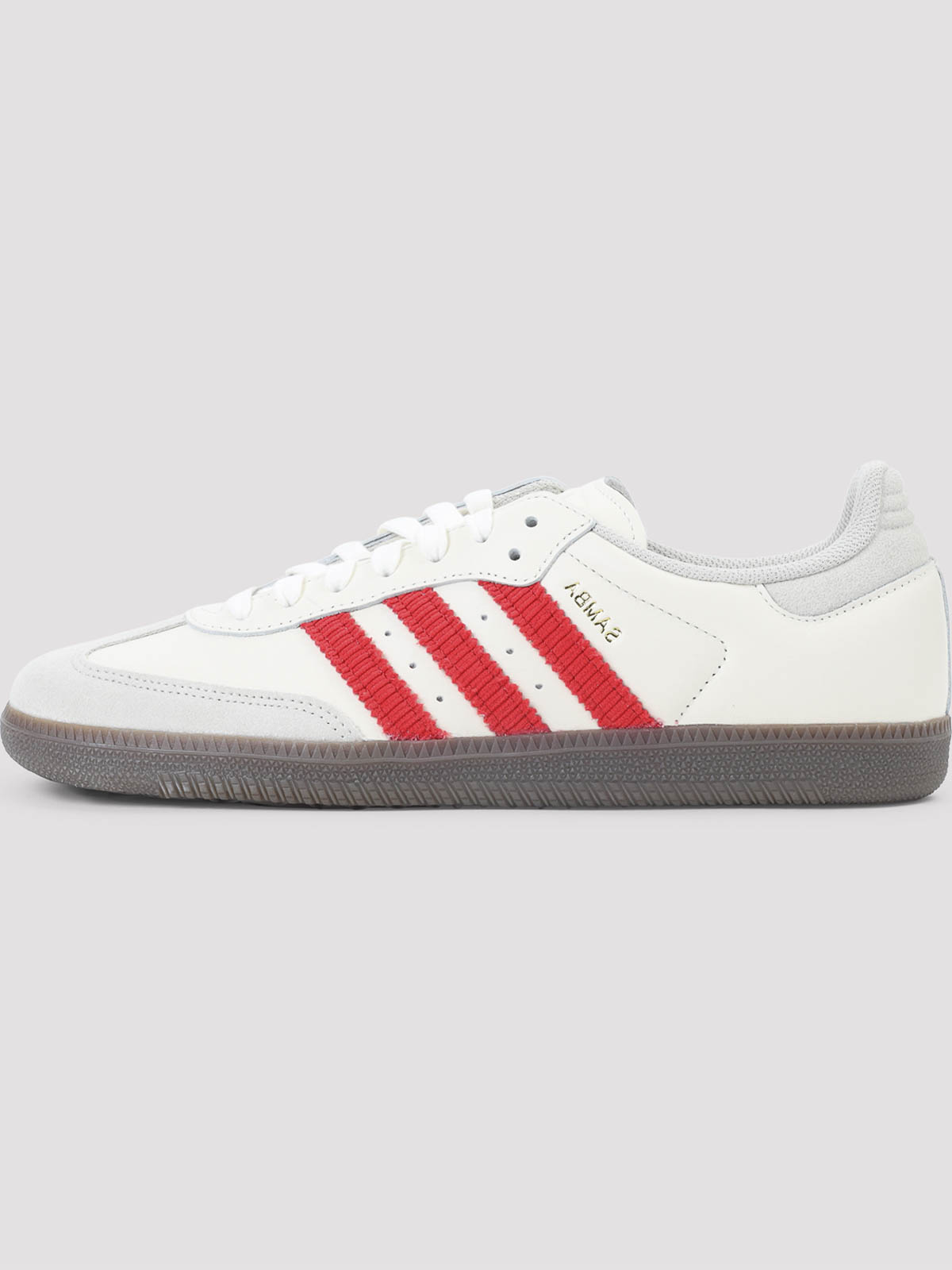 アディダスのサンバ OG オフホワイトレザースニーカー。オフホワイトのレザーにベージュのスエードインサートをあしらったヴァンプ。丸いつま先、レースアップファスナー、タンにエンボス加工ロゴ、サイドにサンバスタンプ、サイドにコントラストカラーの赤いシグネチャーストライプ、テキスタイルの裏地とインソール、茶色のラバーアウトソールが特徴です。