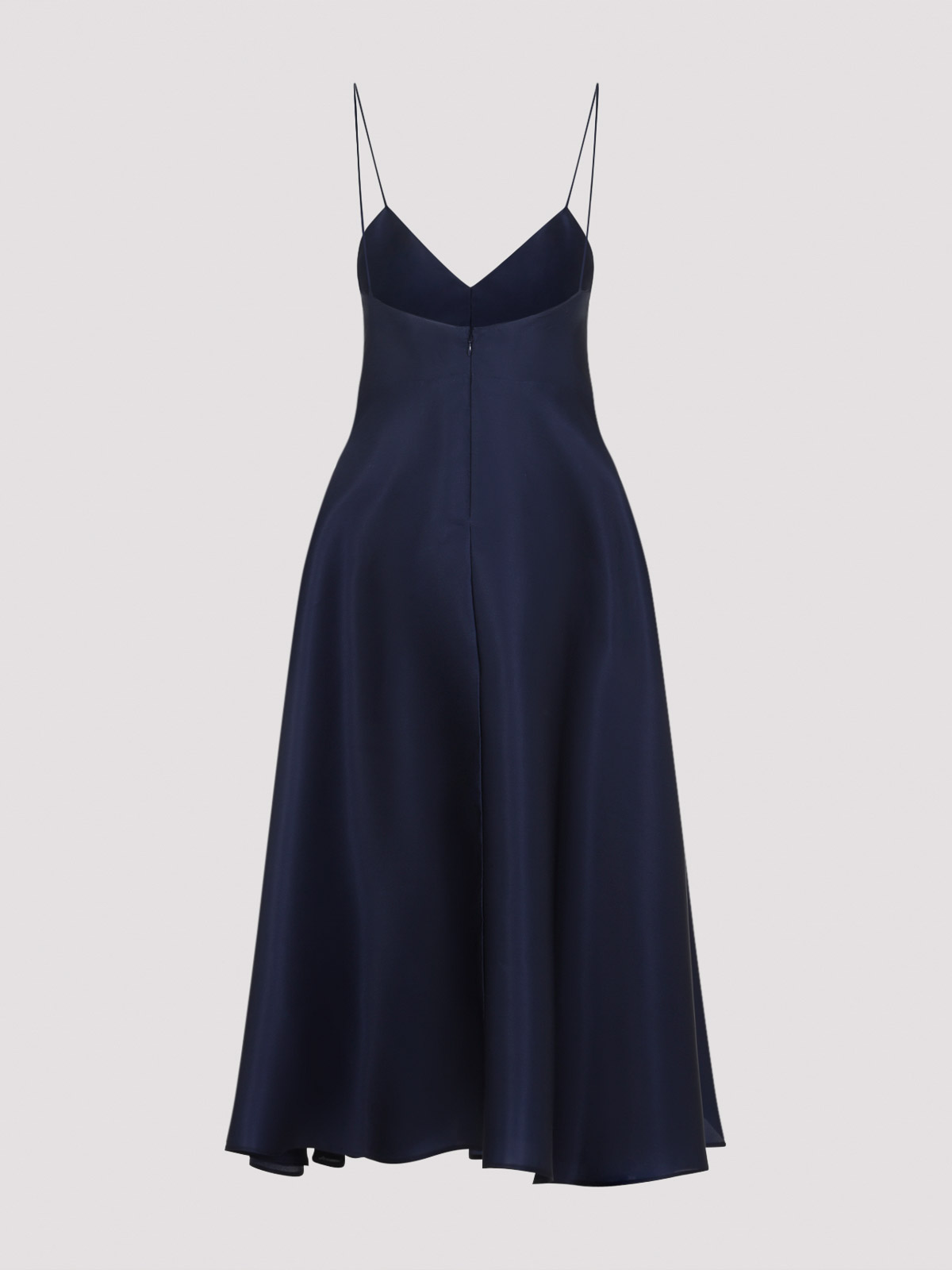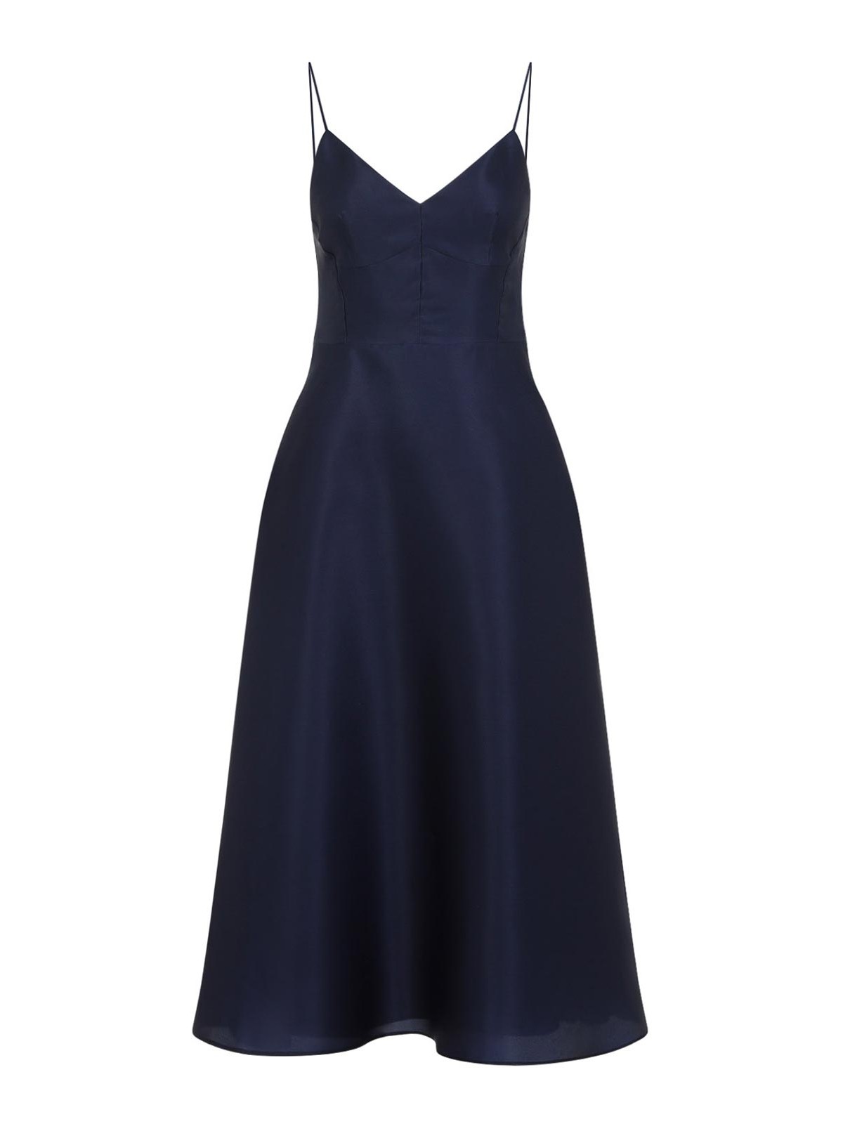 アルバータフェレッティブルーシルクトリプルオーガンザミディドレス。ピュアブルーのシルクドレス、薄いショルダーストラップ、Vネック、ノースリーブ、バックファスナー、ミディ丈、フレアスカート、ストレートヘム。