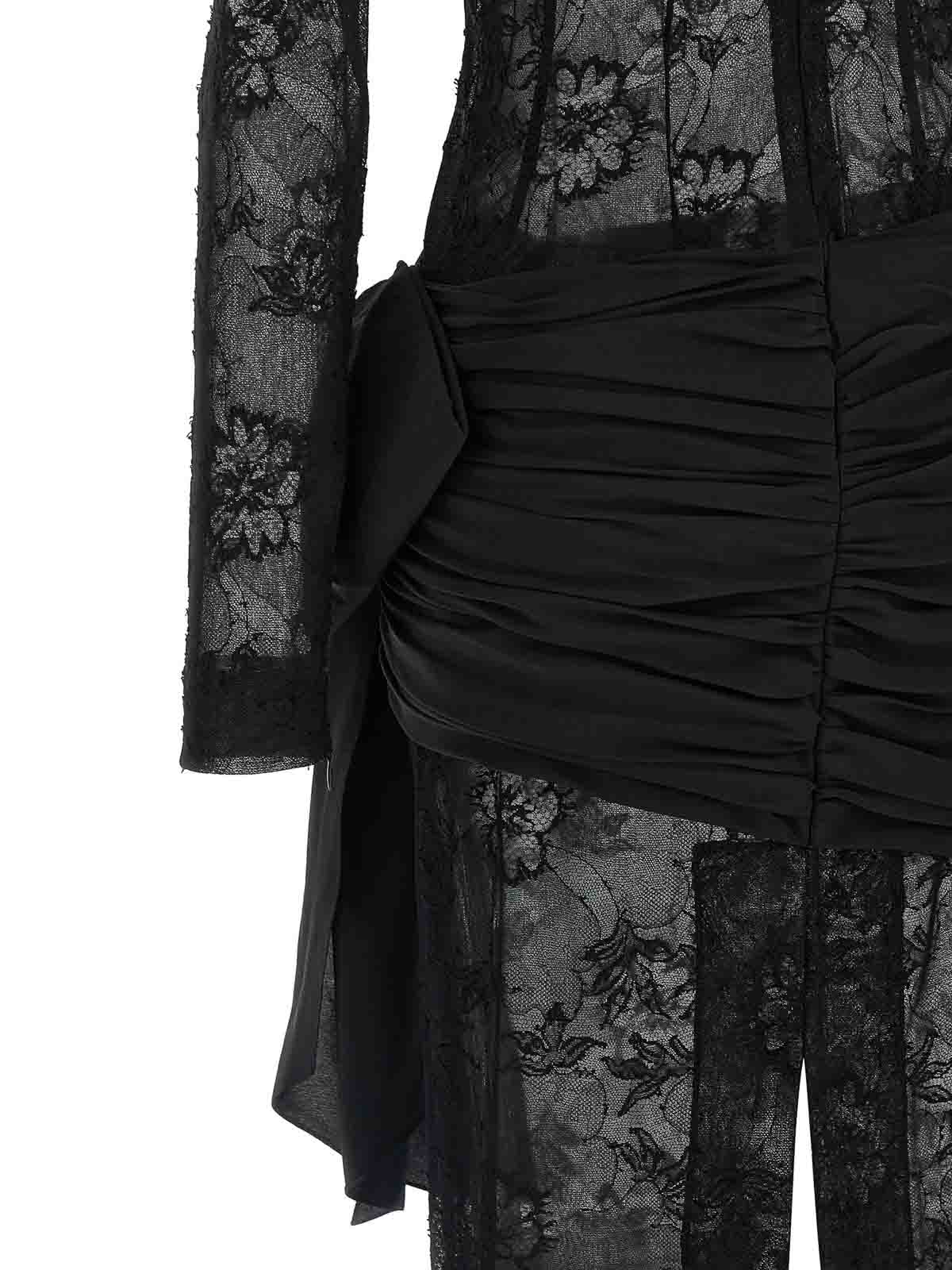 半透明のロングレースドレス、ウエストにカール、ドレープ、マキシボウをあしらったトーン・オン・トーンのシルクインサート、ラウンドネック、裾にジッパー付きのロングスリーブ、ジッパー、バックスプリットが幅広です。