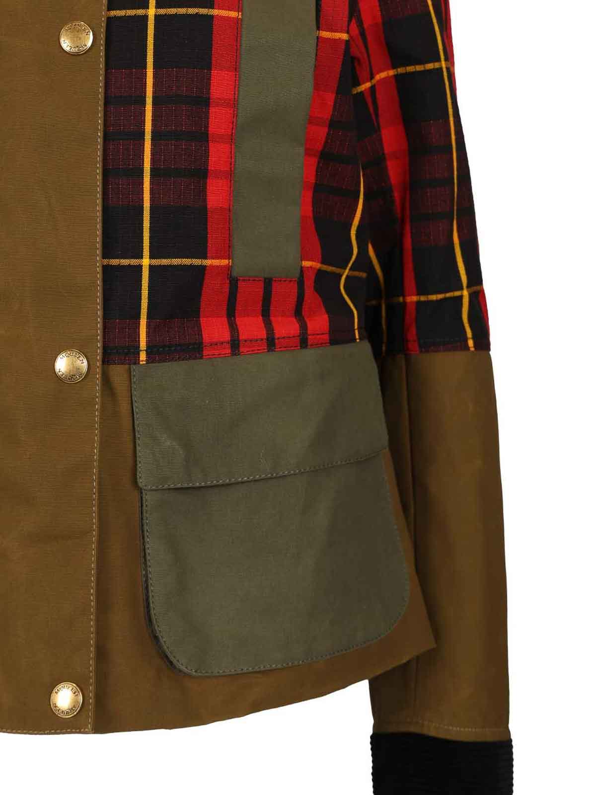 レッド、ブラック、イエローのタータンリップストップパネルをあしらったグリーンのワックスコットンジャケット。コントラストの効いたコーデュロイの襟と袖口、サイドスリットポケット2つ、カーゴポケット2つ、フレアディテール。ジッパーとスナップボタン留め。