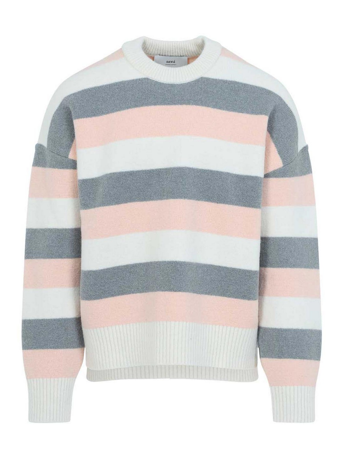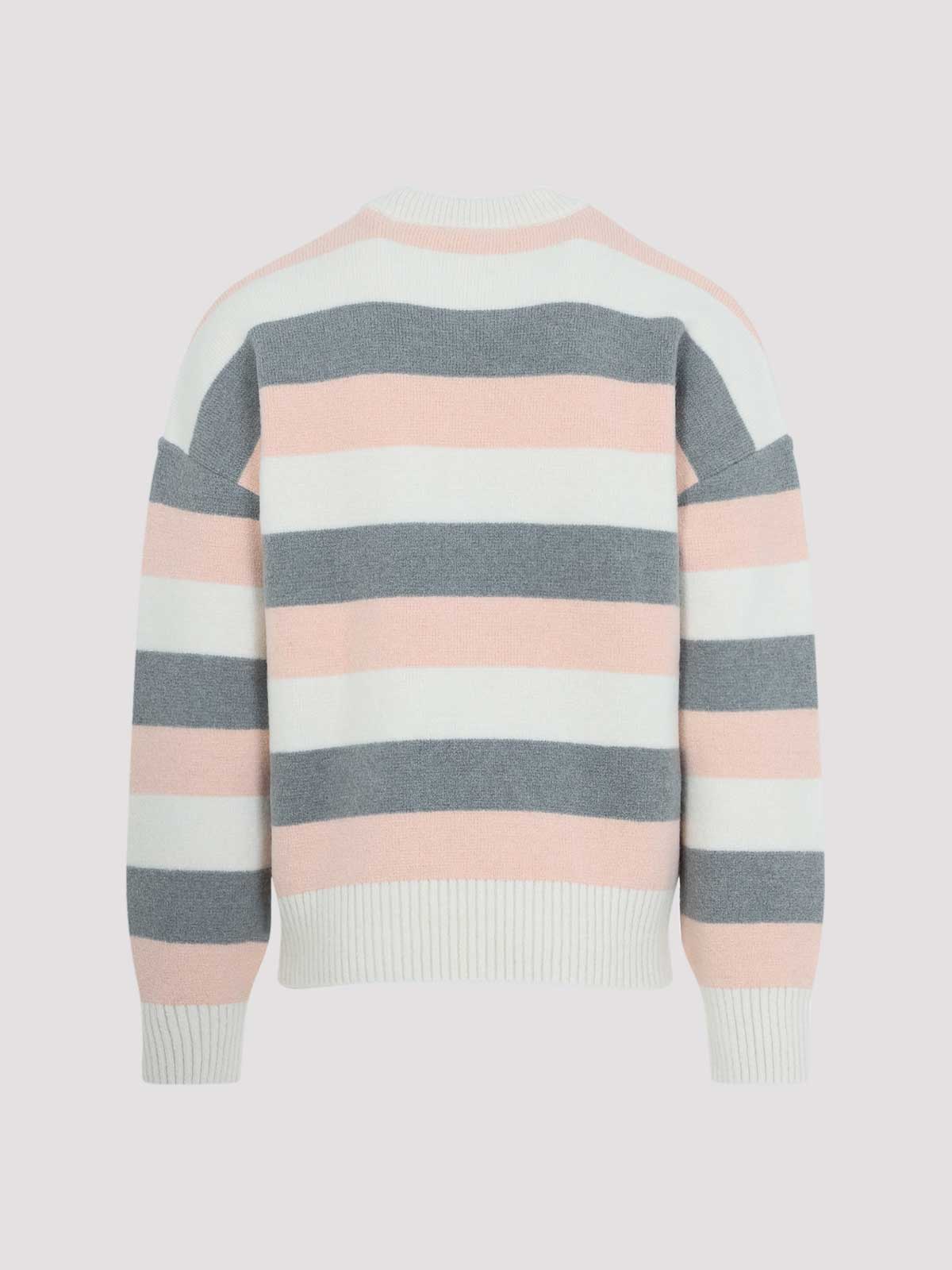 アミグレーのアルパカストライプクルーネックセーター。アルパカ、ウール、ポリアミド、エラステンのブレンドで作られています。ラウンドリブネック、ドロップショルダー、ロングスリーブ、リブ編みの袖口と裾、アシンメトリーヘム。グレー、パウダーピンク、オフホワイトのストライプ柄が全面に施されています。