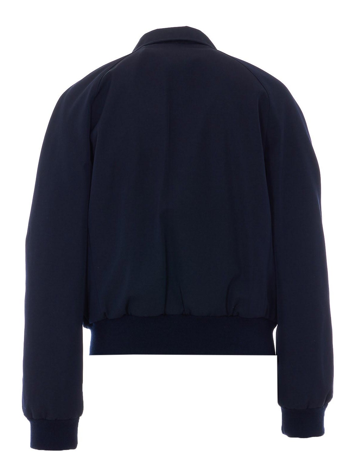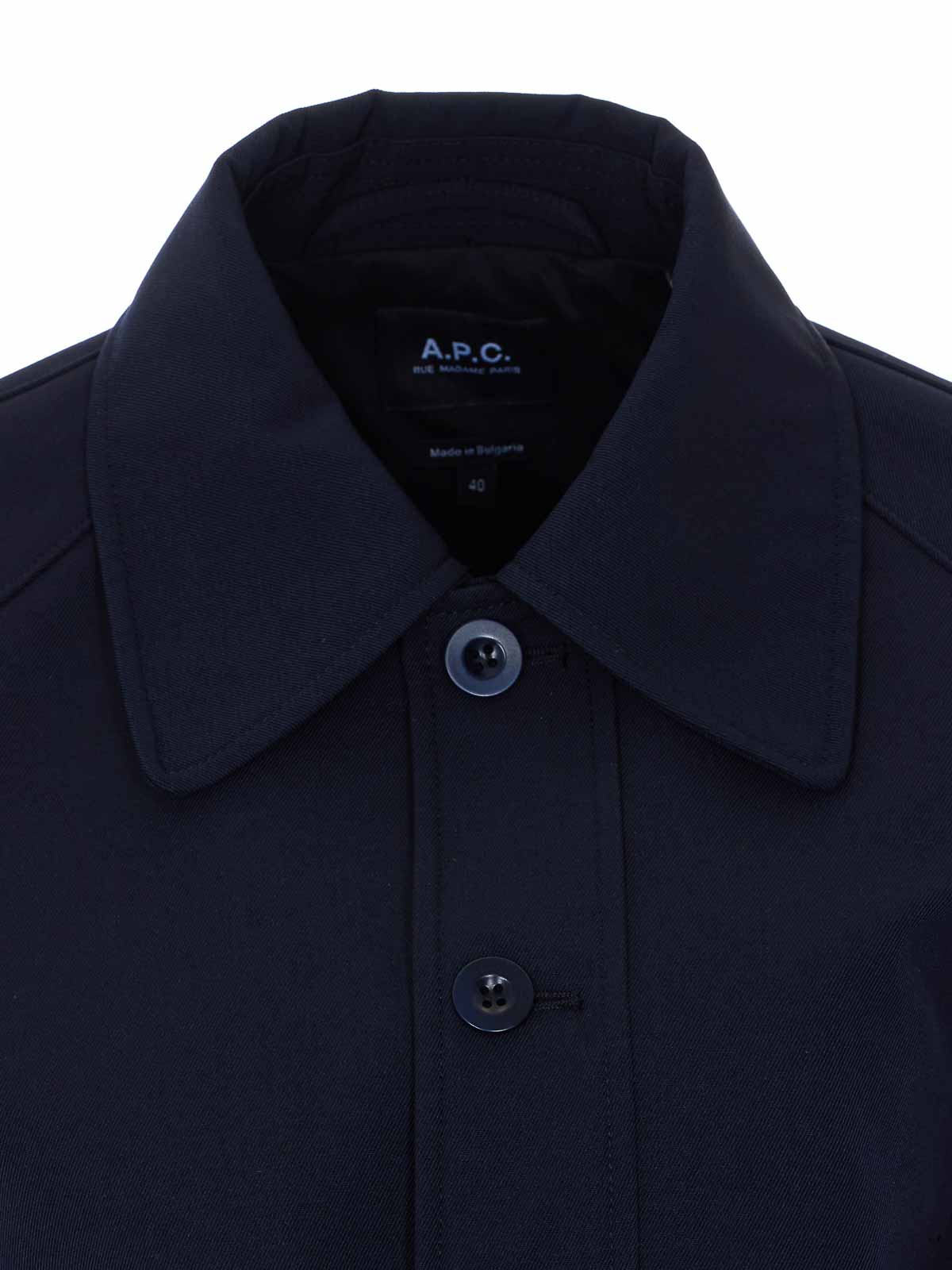 A.P.C. ダークネイビージャケット、フロントボタン留め、ロングスリーブ、レギュラーカラー、ボタン留め付きポケット、ウエストと袖口にゴム入り