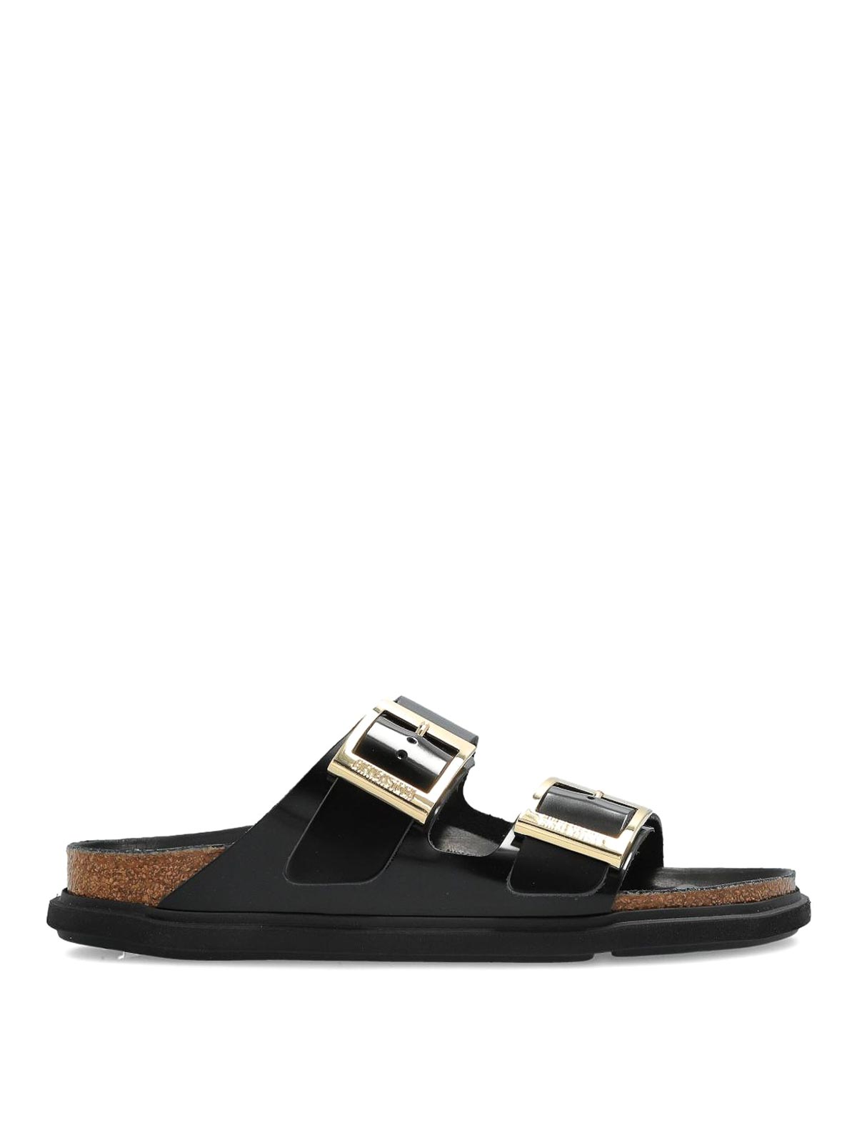 Birkenstock「arizona」ブラックパテントエフェクトスリッパ、ゴールドバックル付き