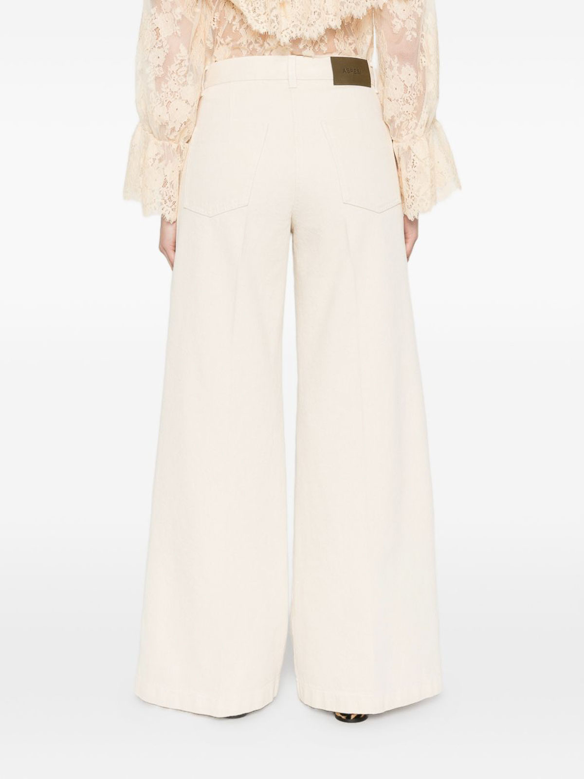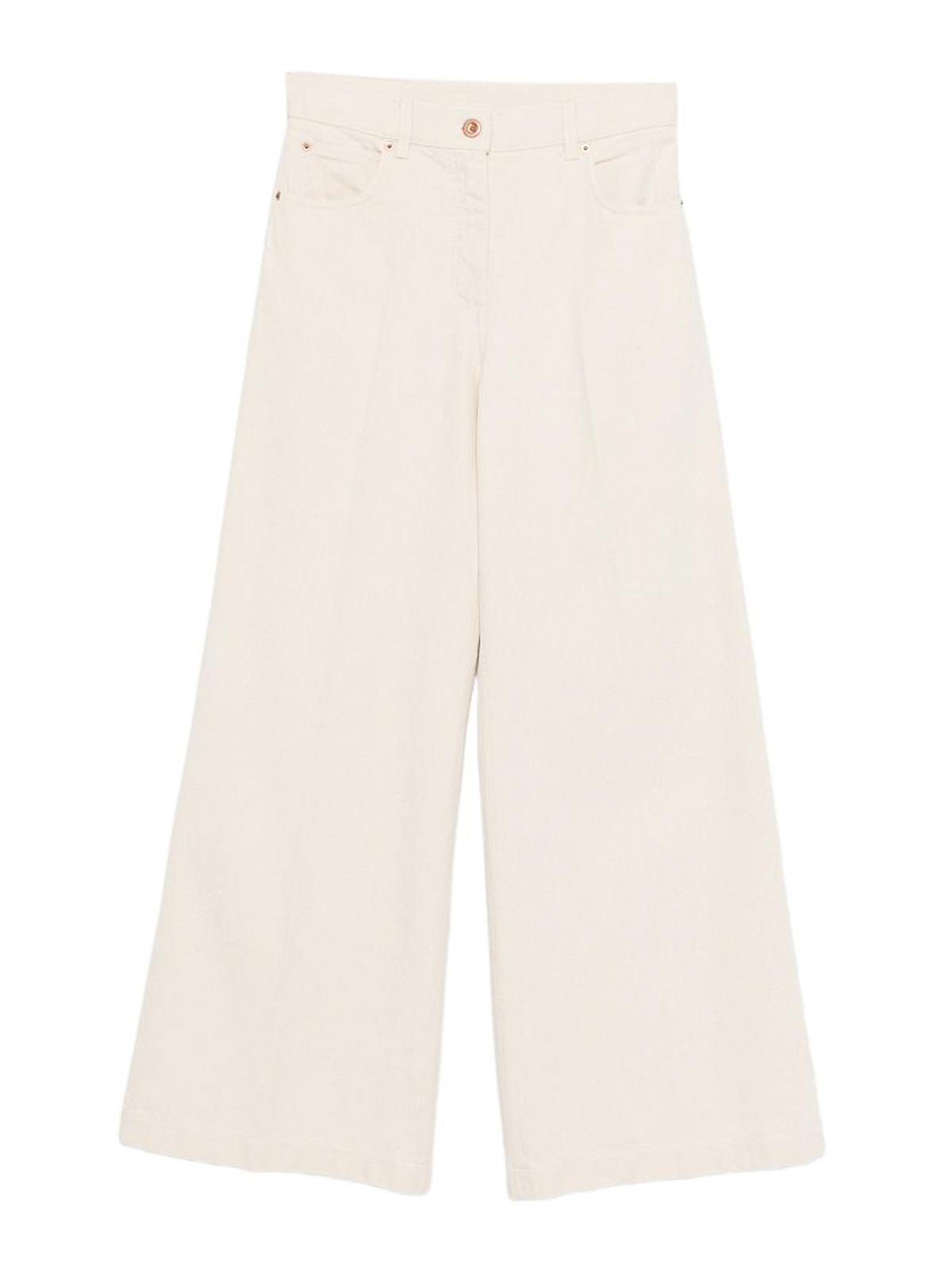 aspesiのアイボリーコットン製ワイドレッグパンツ。ベルトループ、5つのポケット、ボタン留めが特徴です。ゆったりとした流れるようなデザインがシルエットを現代的なエレガンスで引き立て、カジュアルで洗練された、多彩なスタイルにぴったりです。