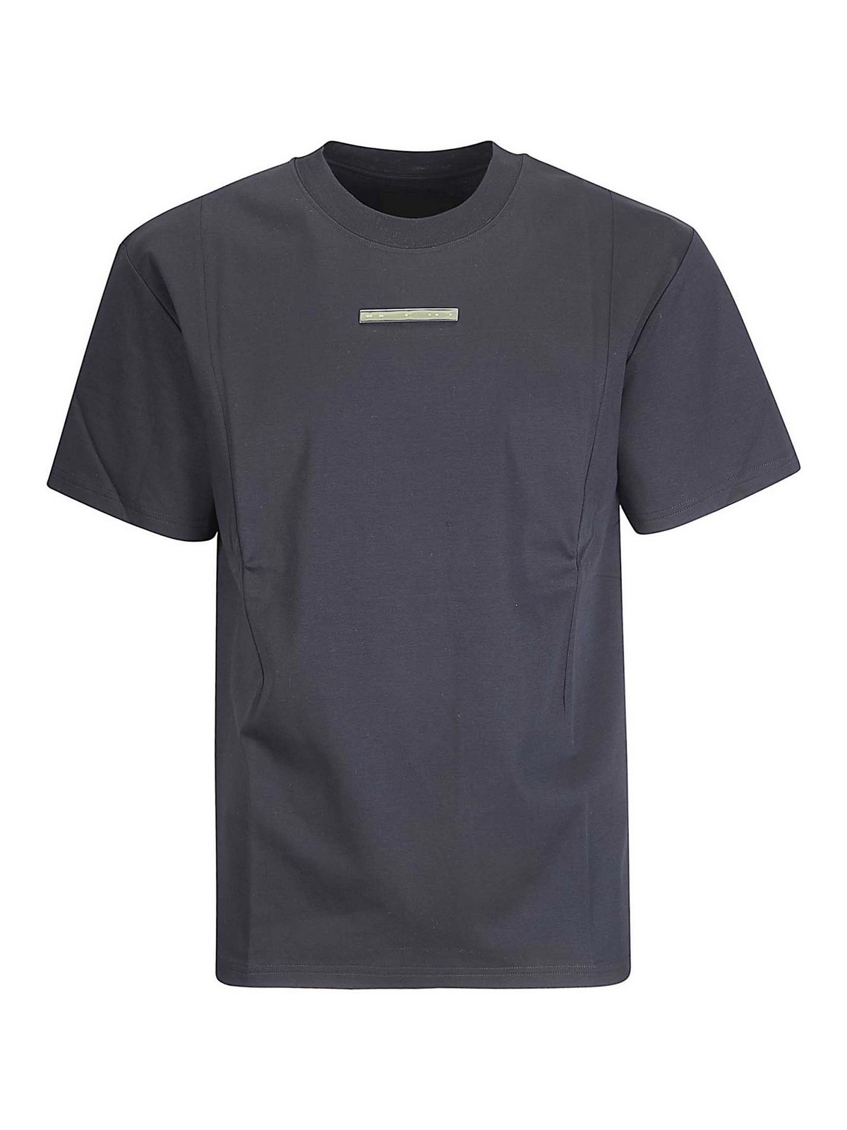 胸のメタルバーにロゴが入ったレギュラークルーネックTシャツ。