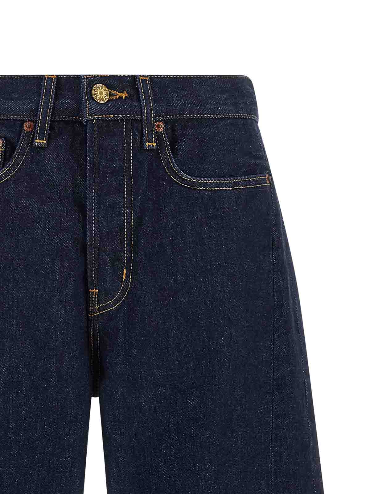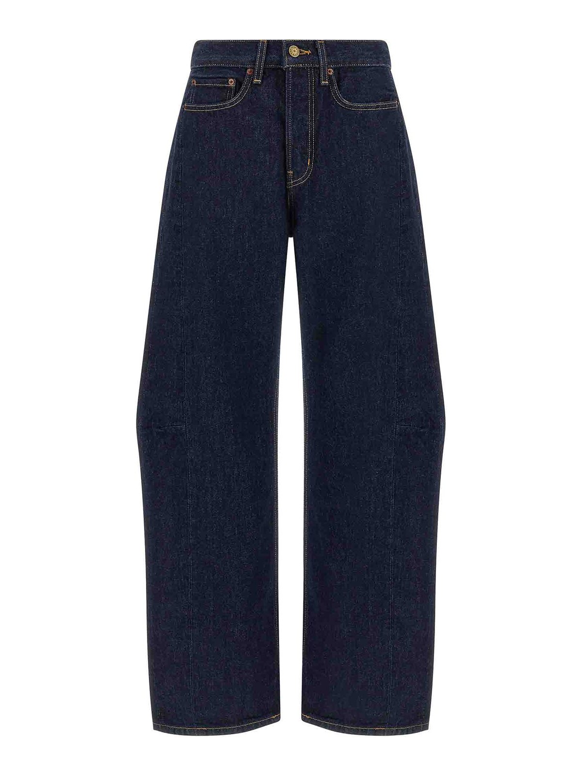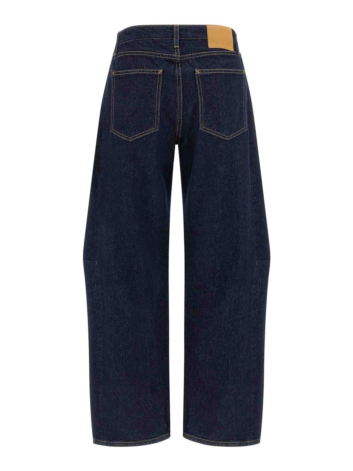 Slim Lassoの両面ジャパニーズデニムジーンズはコントラストステッチ、ややカーブしたワイドレッグ、サイドピンタック、フロントボタン留め、ポケット5つ、バックロゴタグ付き。