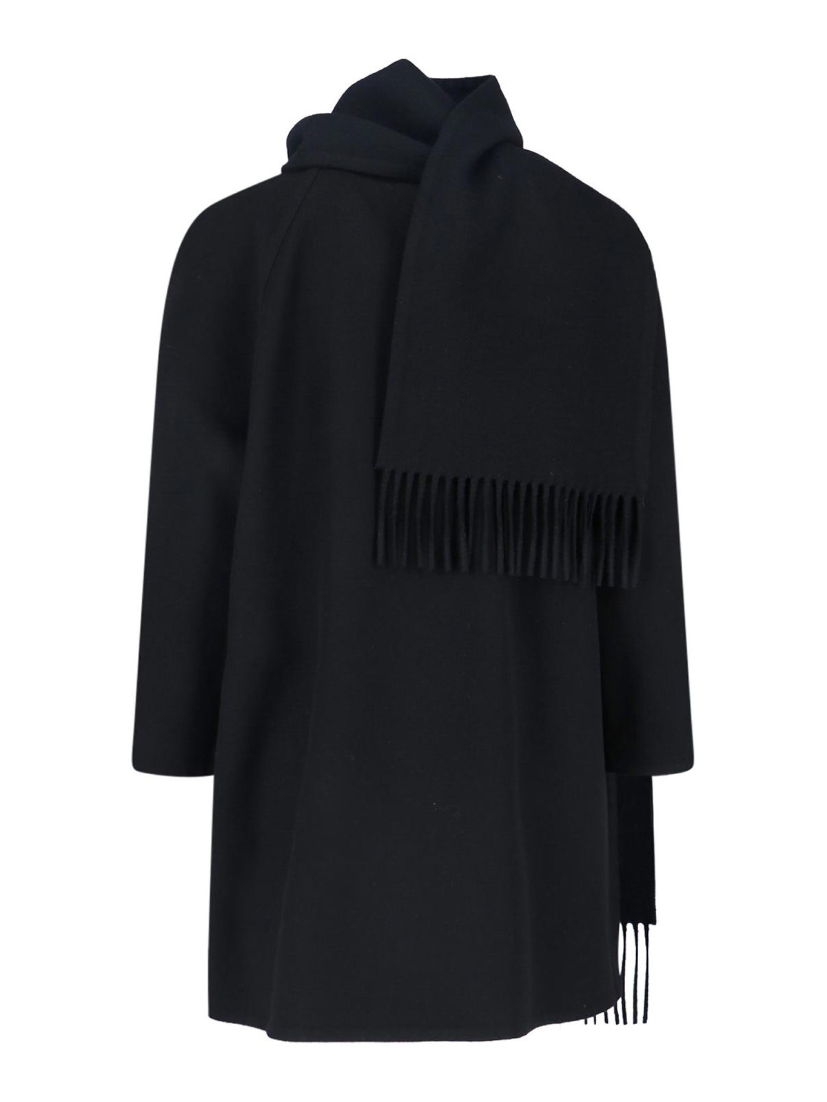 バレンシアガカシミアコート、ブラック、襟にスナップボタン留め、ラウンドネック、調節可能なマキシスカーフ、裾にフリンジディテール、サイドポケット2つ、ストレートヘム。