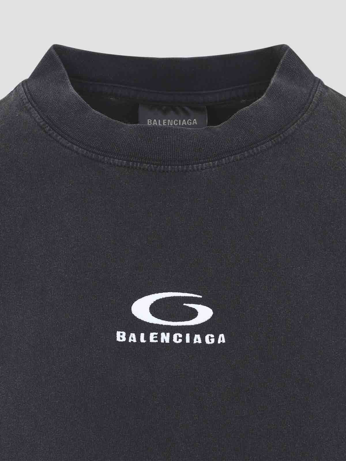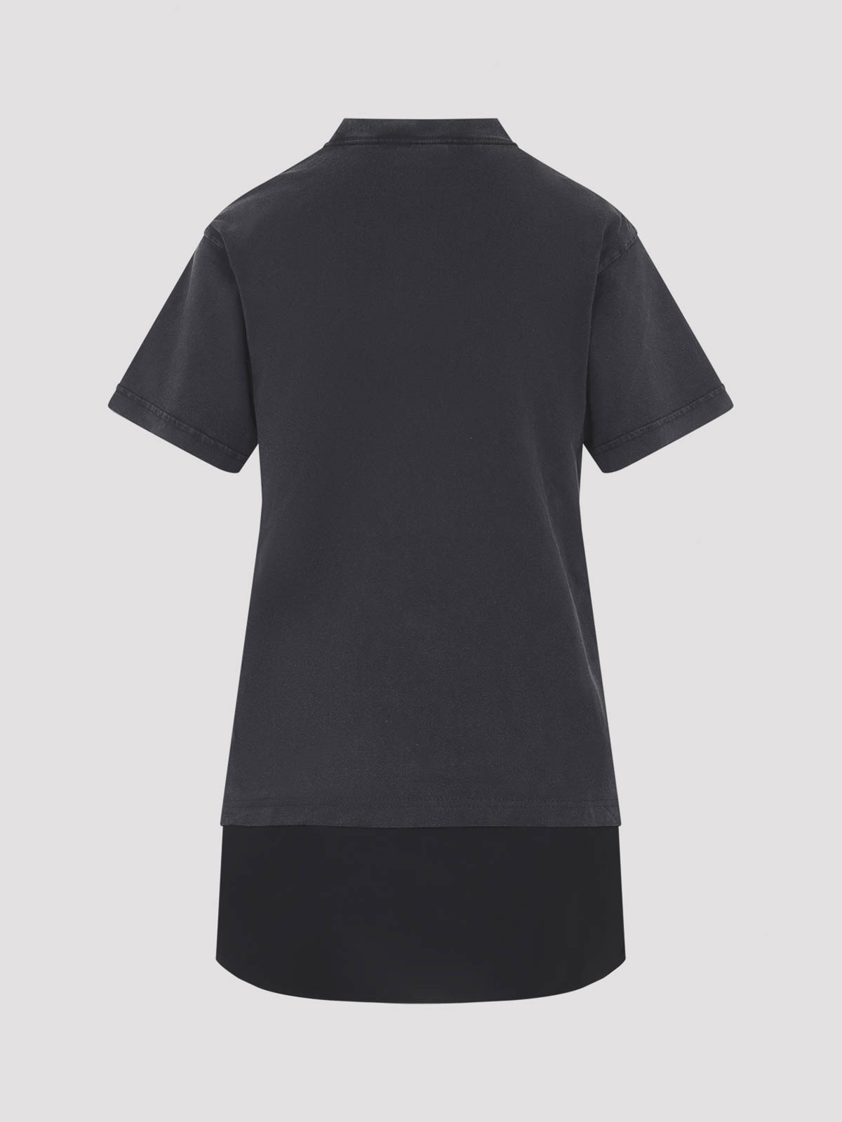 バレンシアガのハイブリッドブラックコットンミニドレス。色あせたブラックのコットンジャージー製で、ラウンドネック、胸、半袖のコントラストの効いた白いロゴ、シャツ風の裾が特徴です。