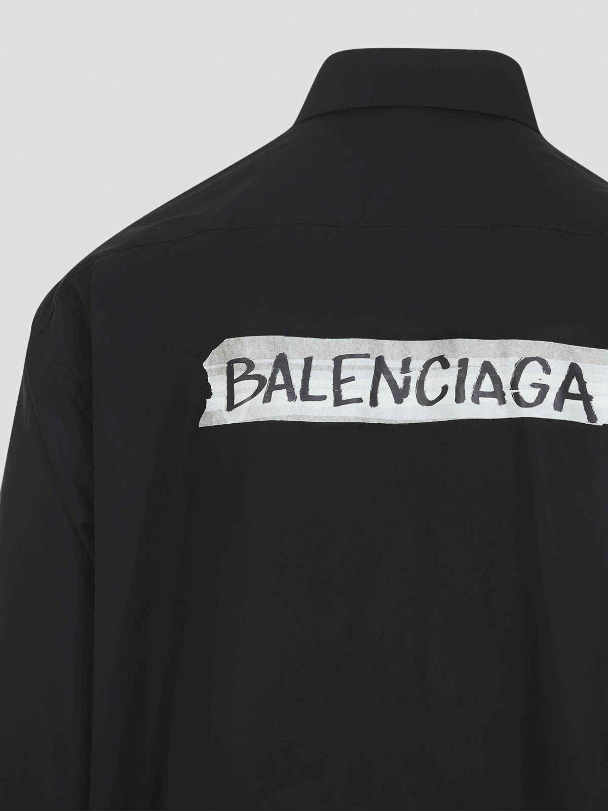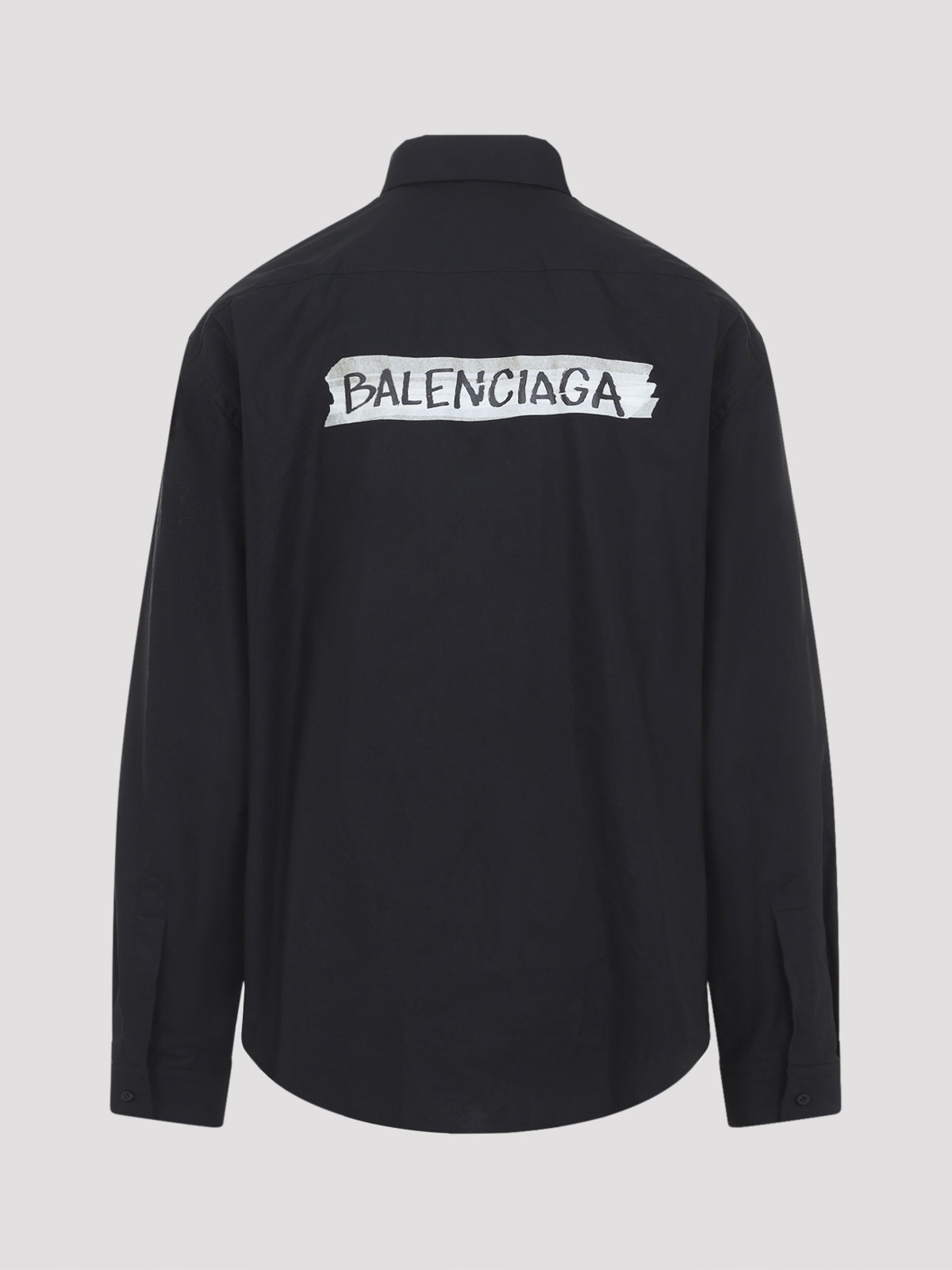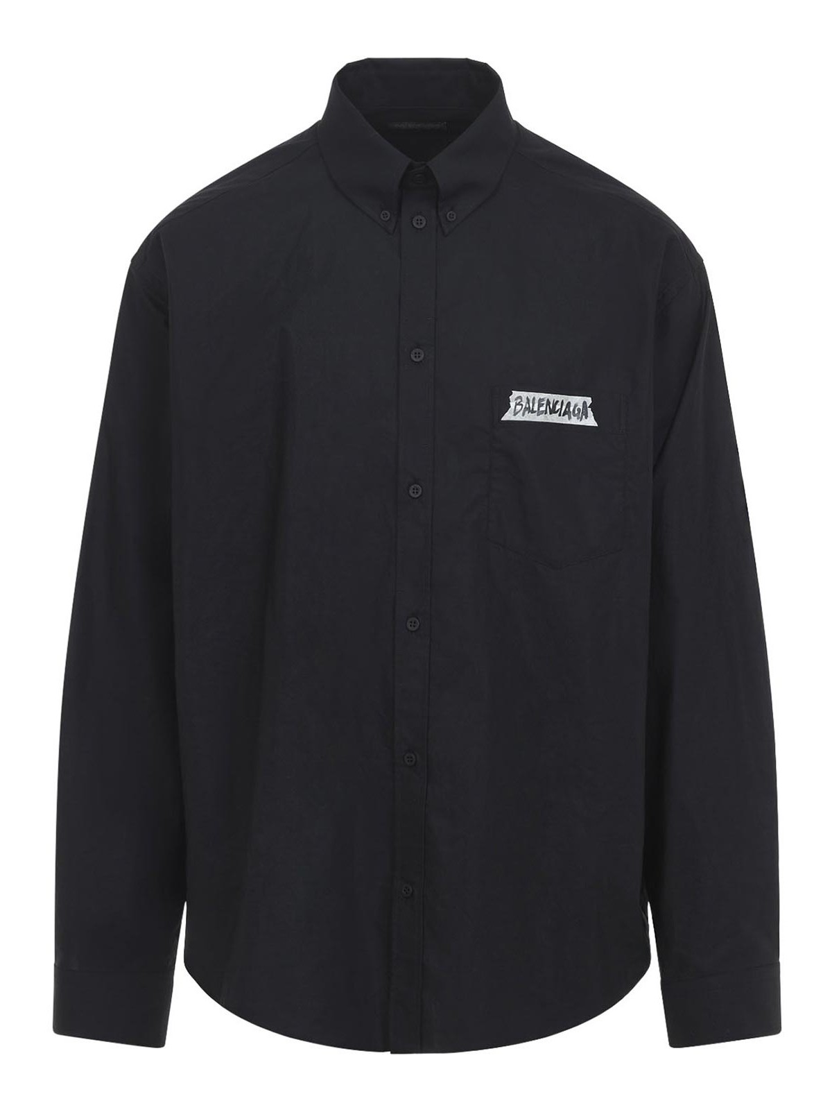 Balenciaga LS ラージフィットブラックコットンシャツ。ブラックコットンポプリン製のラージフィットシャツ。ボタンダウンカラー、フロントボタン留め、胸にパッチポケット1つ、前面と背面にマスキングテープのロゴ刻印入り、ボタン付きカフス付き長袖、バックヨーク、ラウンドヘムが特徴です。