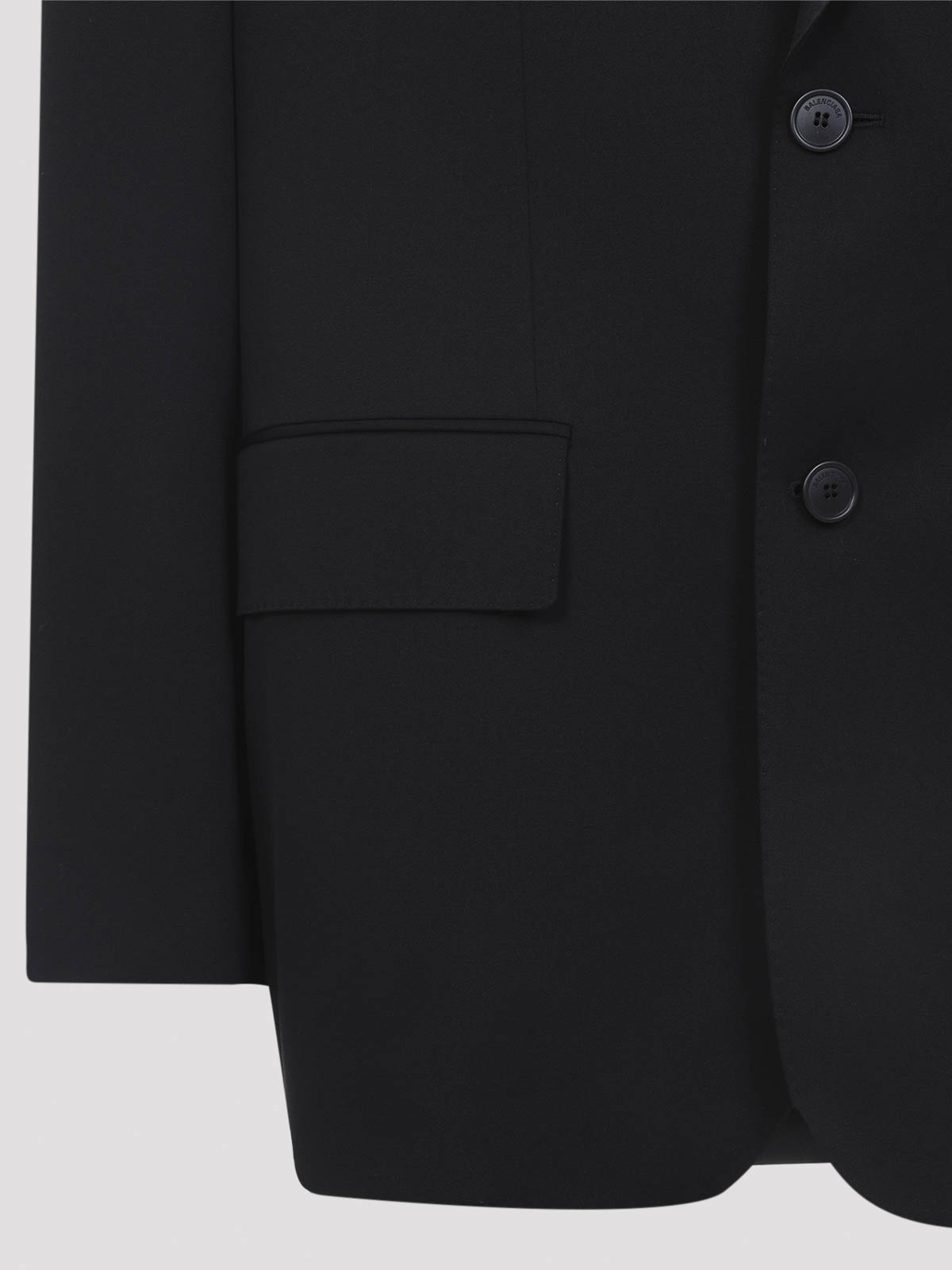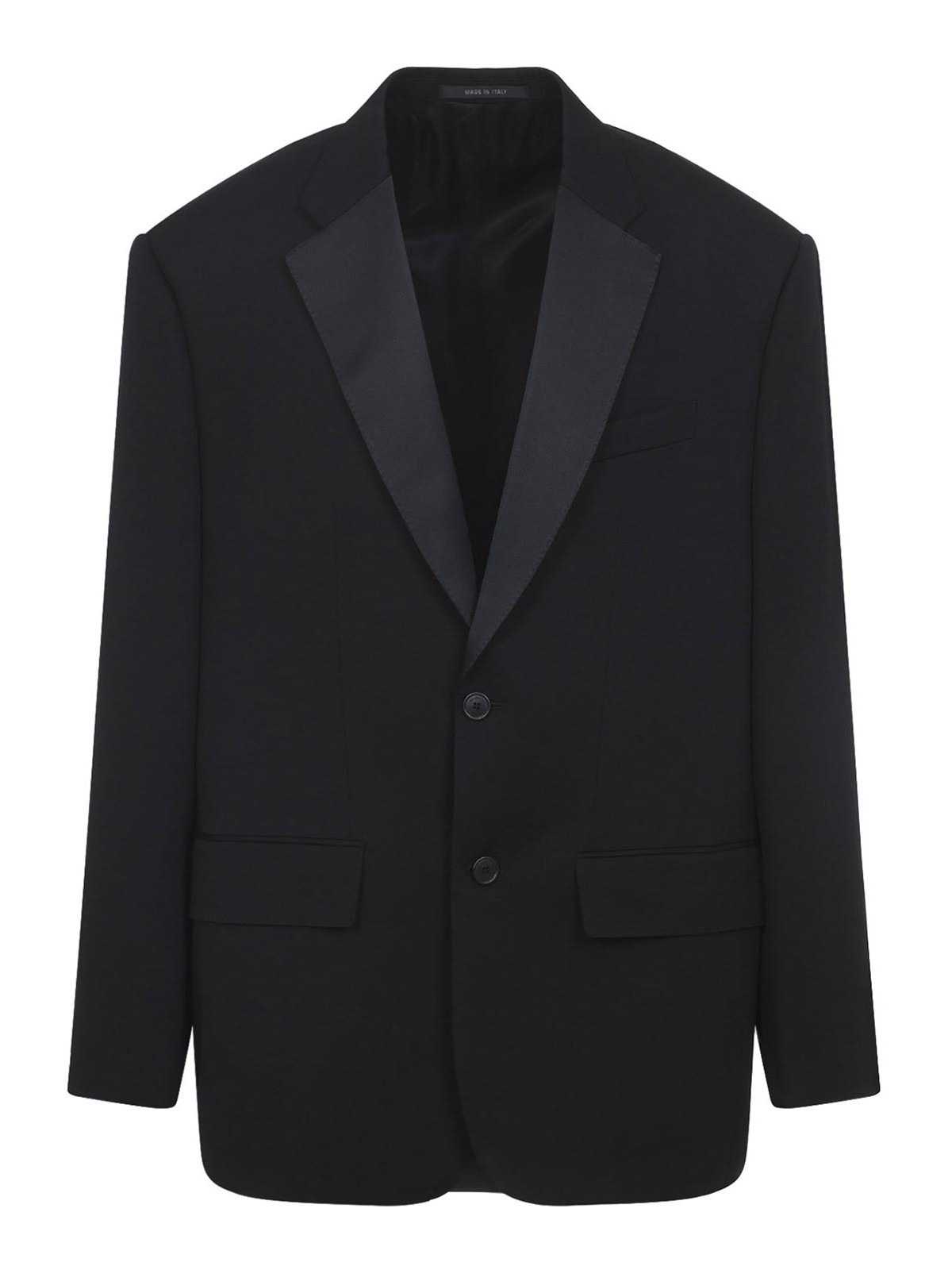 バレンシアガタキシードブラックウールジャケット。ブラックウール製のオーバーサイズジャケット。サテンのノッチドラペル、ボタン留めのシングルブレスト、胸にウェルトポケット、フロントにフラップポケット2つ、補強ショルダー、ボタン付きカフス付きロングスリーブ、バックベント2つ、フルライニングが特徴。