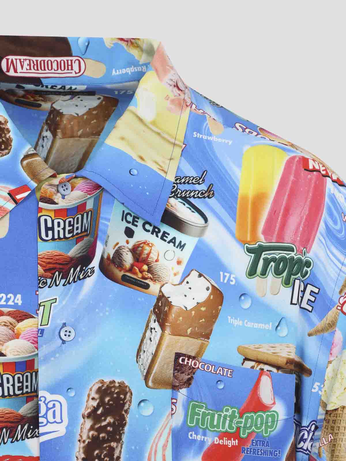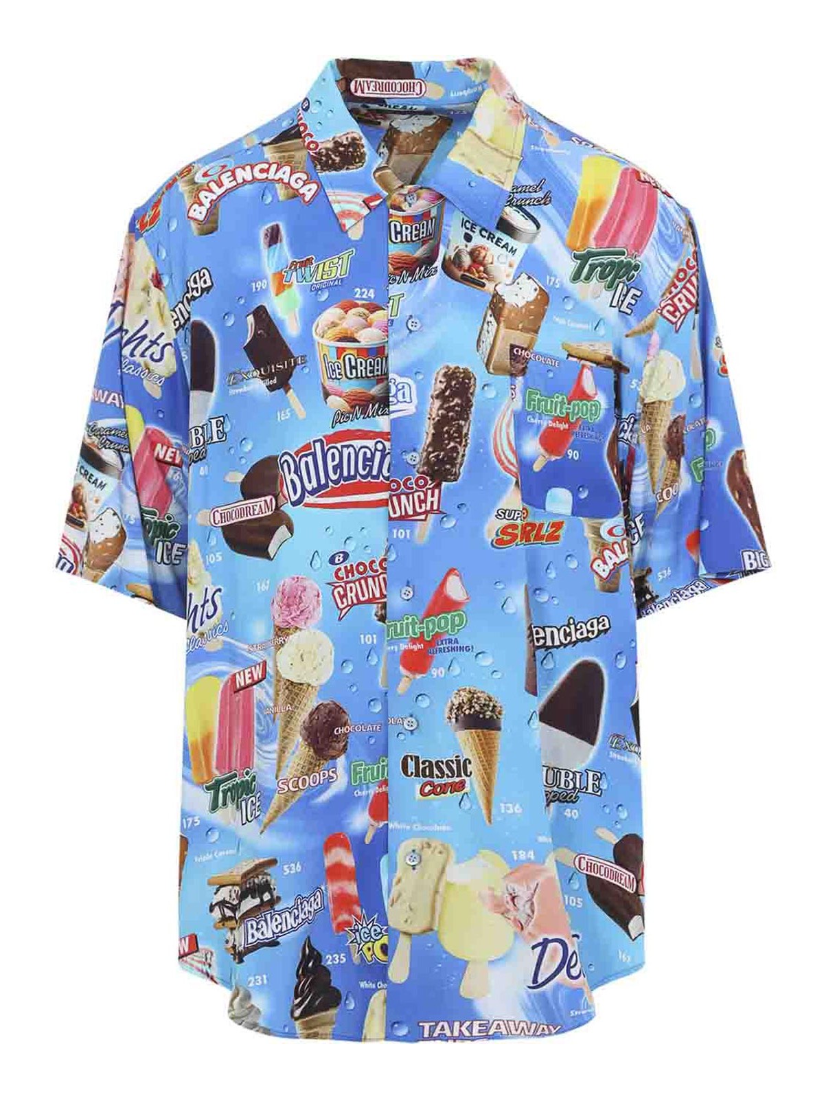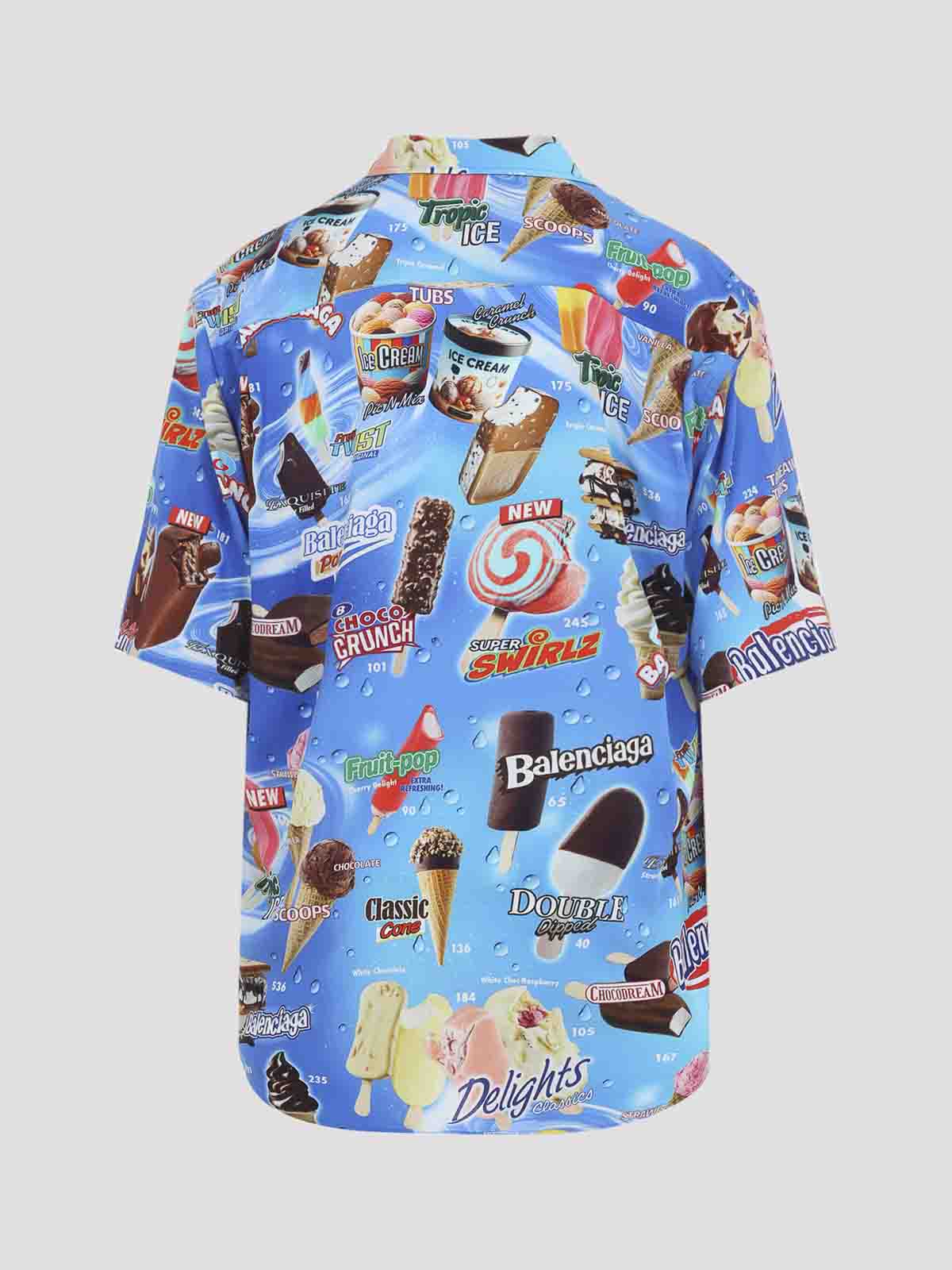 Balenciaga ss ミニマルブルービスコースシャツ。ライトブルーのビスコースポプリンを使用し、全体にシグネチャーのスウィートトリートプリントをあしらいました。ポインテッドカラー、フロントボタン留め、胸のパッチポケット、半袖、丸い裾が特徴です。
