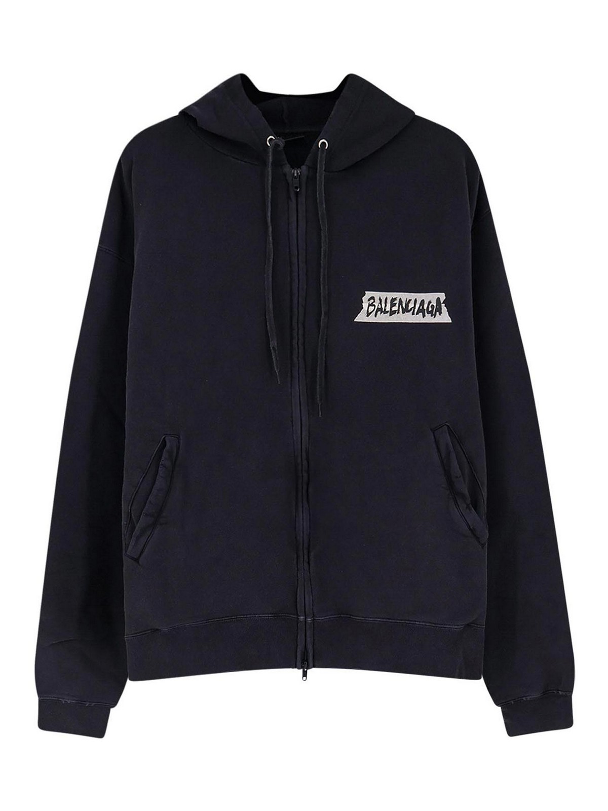 調節可能なドローストリング付きフード、ロングスリーブ、ジップクロージャー、フロントロゴプリント、サイドポケット2つ、100%コットン。