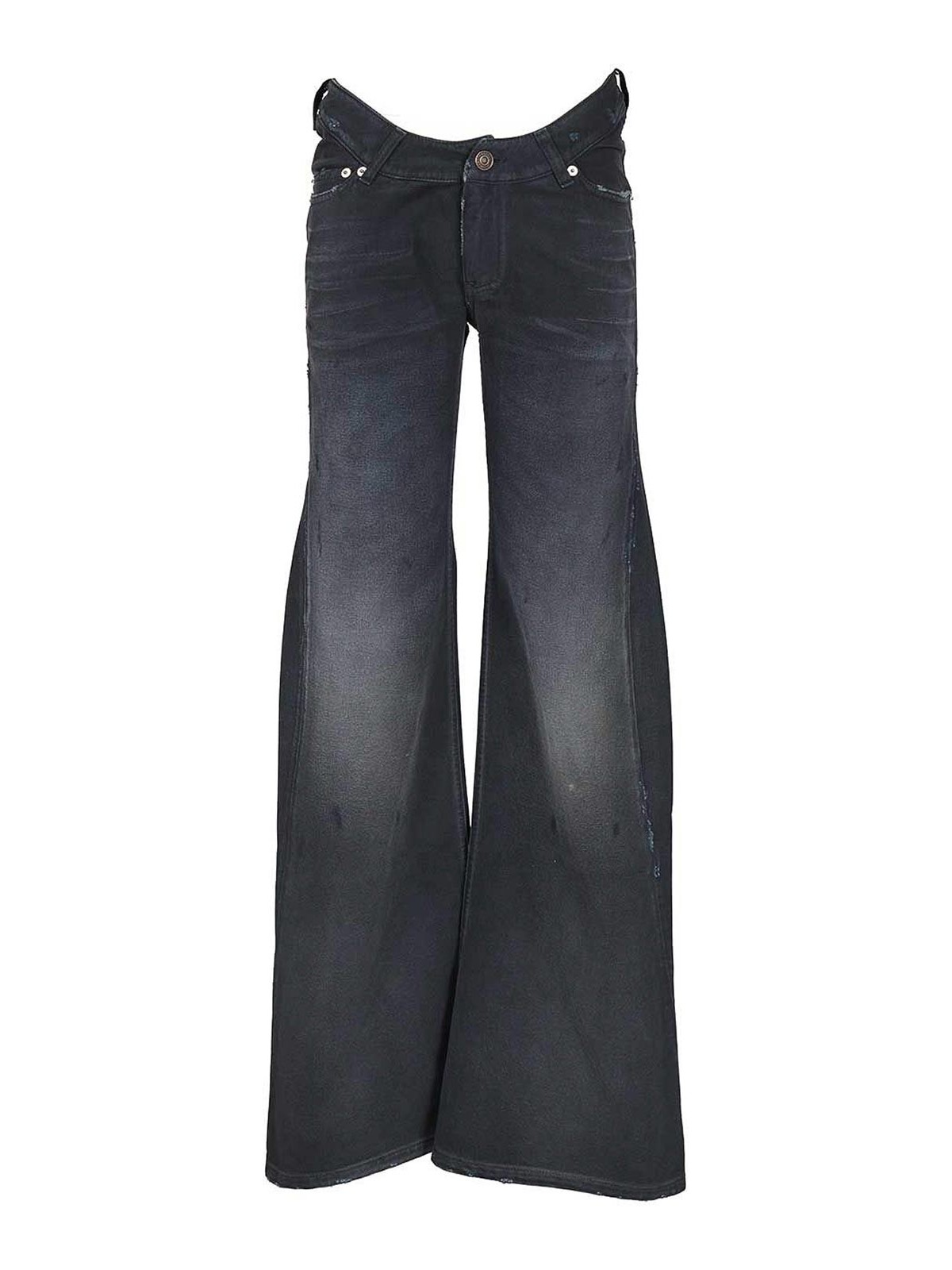 ユーズドエフェクトコットンデニムジーンズ、カーブウエスト、ワイドフレアレッグ、フロントジッパー、ボタン留め、ポケット5つ。