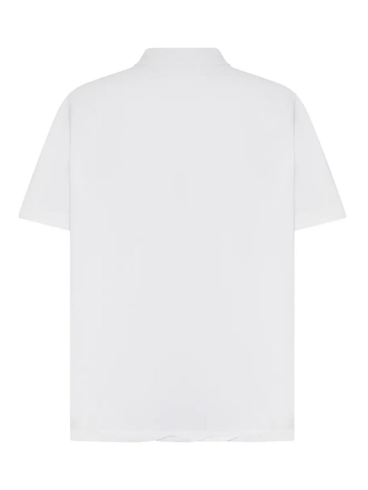 デザイナーカラー:ホワイト、コットン、レギュラーフィット、フラットポロカラー、フロントボタン留め、胸にロゴ刺繍、半袖、互い違いヘム。
