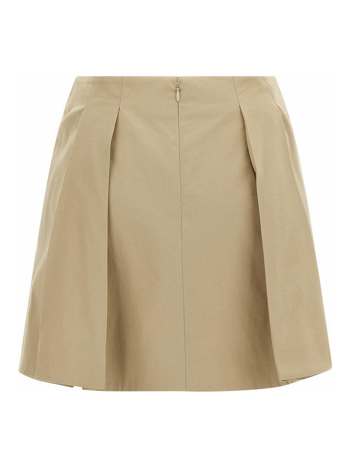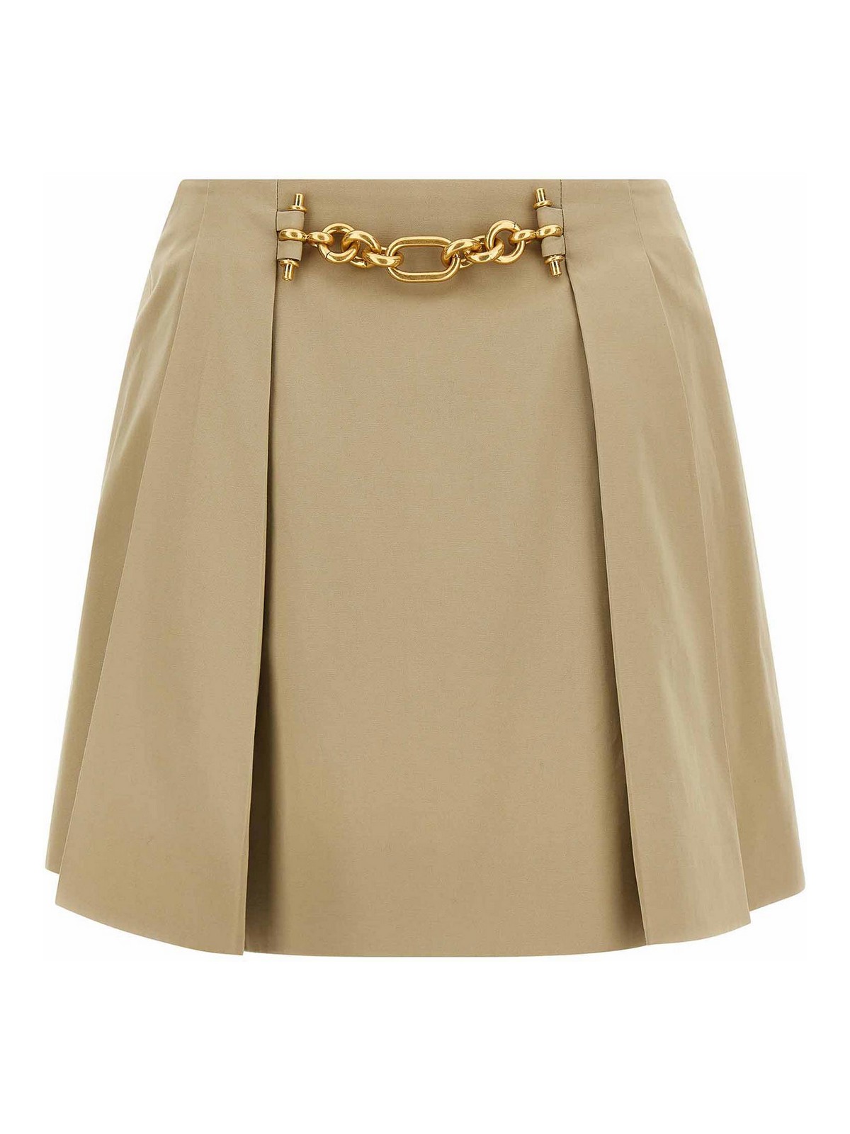 フレアプリーツシルエットのコットンギャバジンミニスカート。フロントにはアンティーク調のチェーンディテール、バックファスナー、コットンブレンド、トーン・オン・トーンのビスコース裏地が付いています。