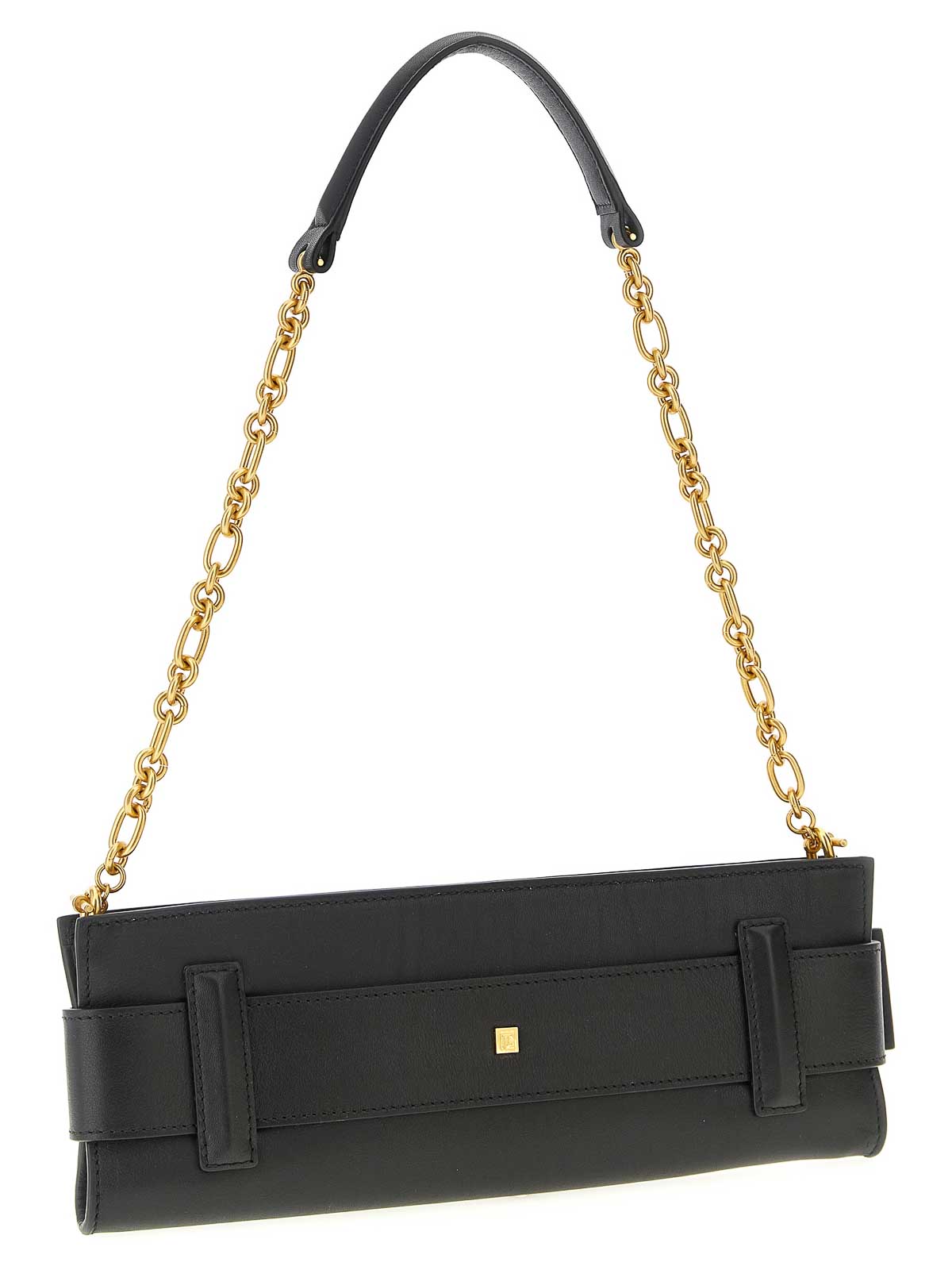 Anthem' スムースレザークラッチ、フロントベルト、マキシメタルバックル、ジッパー、取り外し可能なチェーン、レザーショルダーストラップ付き。