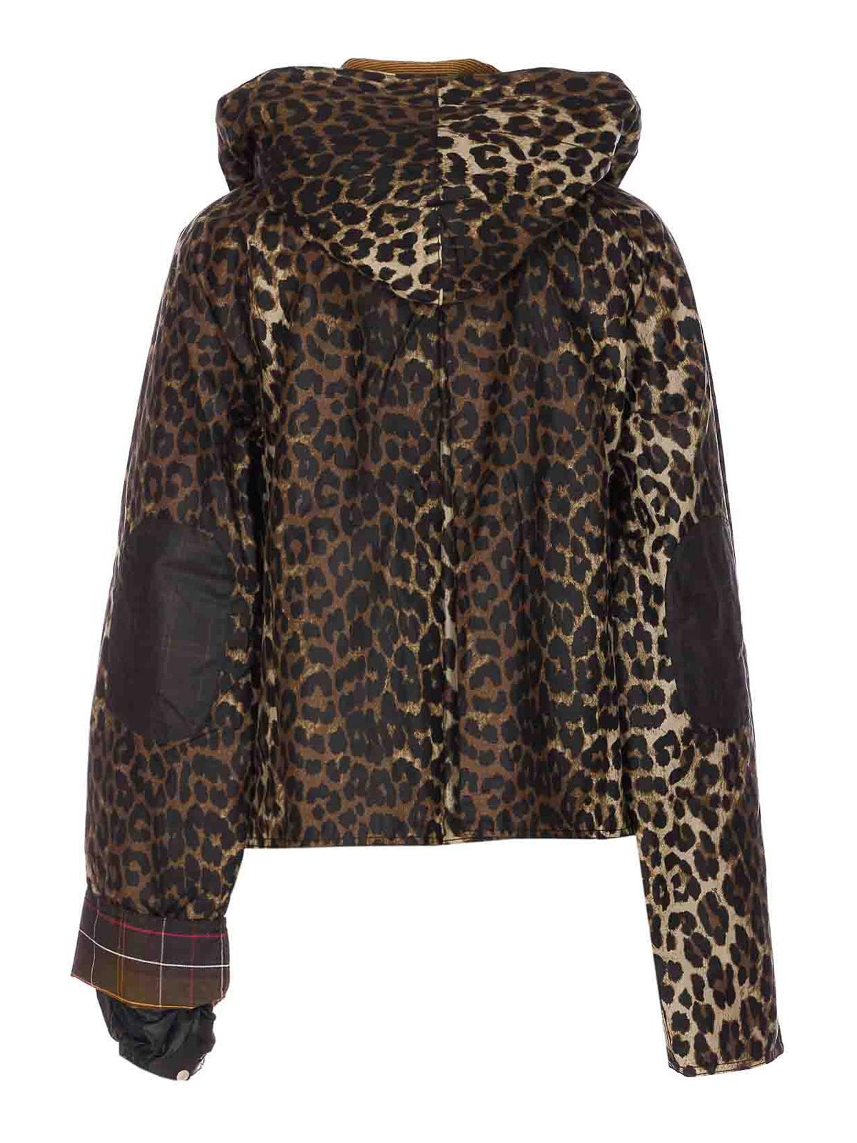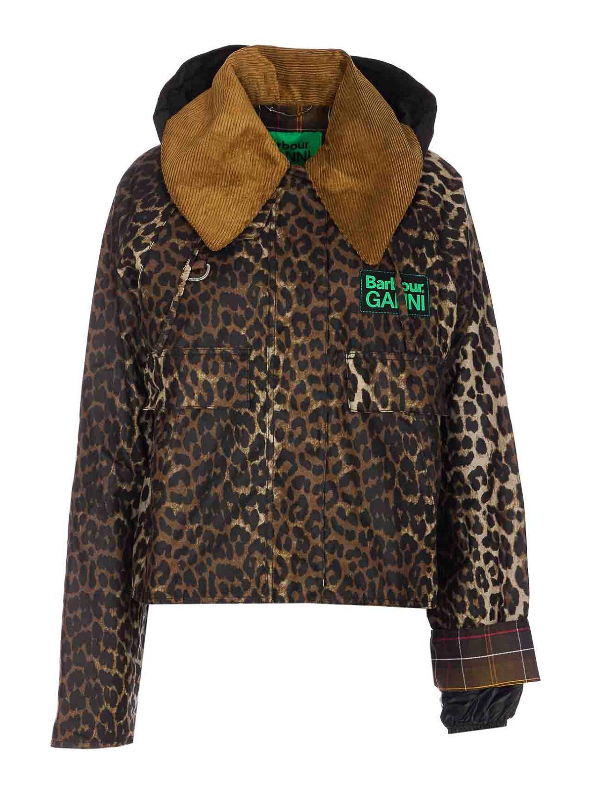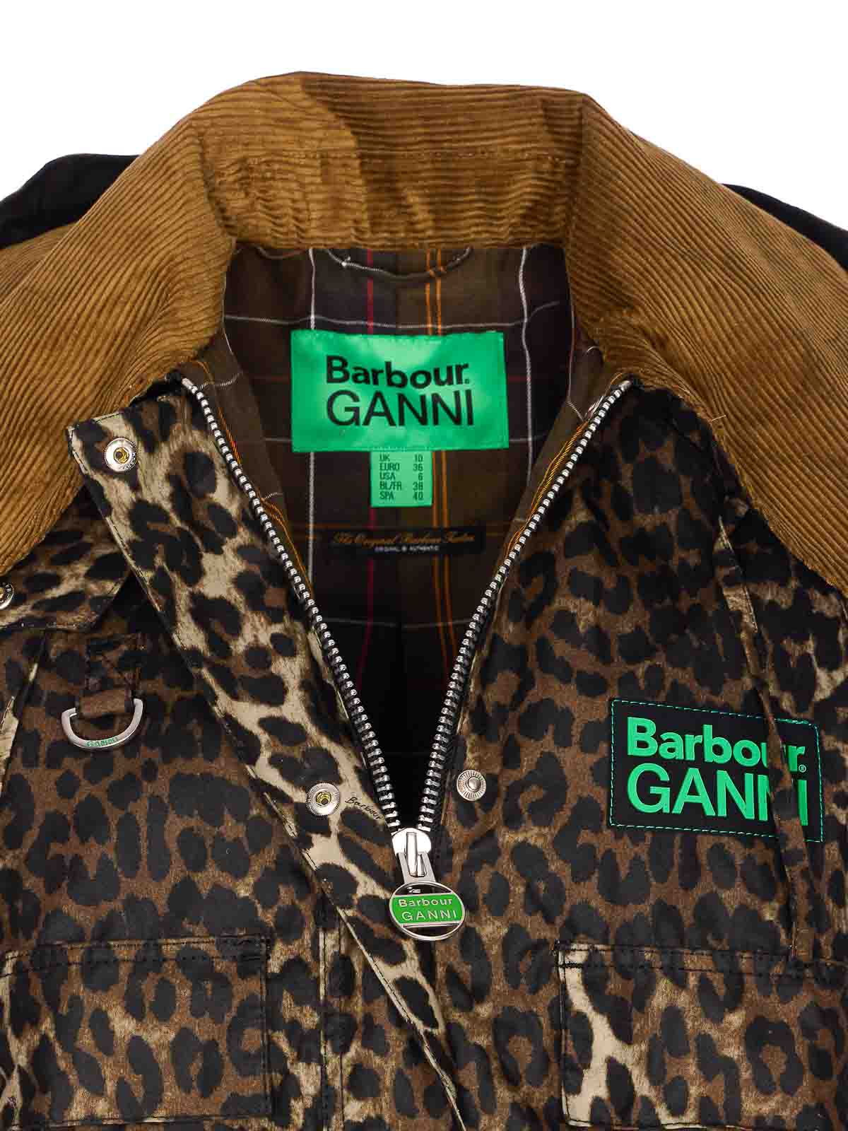 Barbour x ganni ヒョウ柄ジャケット、前面にファスナーとボタン留め、襟、長袖、前面にパッチ、ポケット