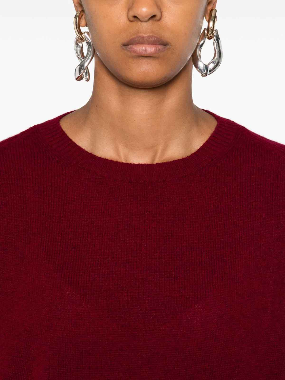 ダークレッドカシミアクルーネックロングスリーブサイドスプリットリブ編みトリム