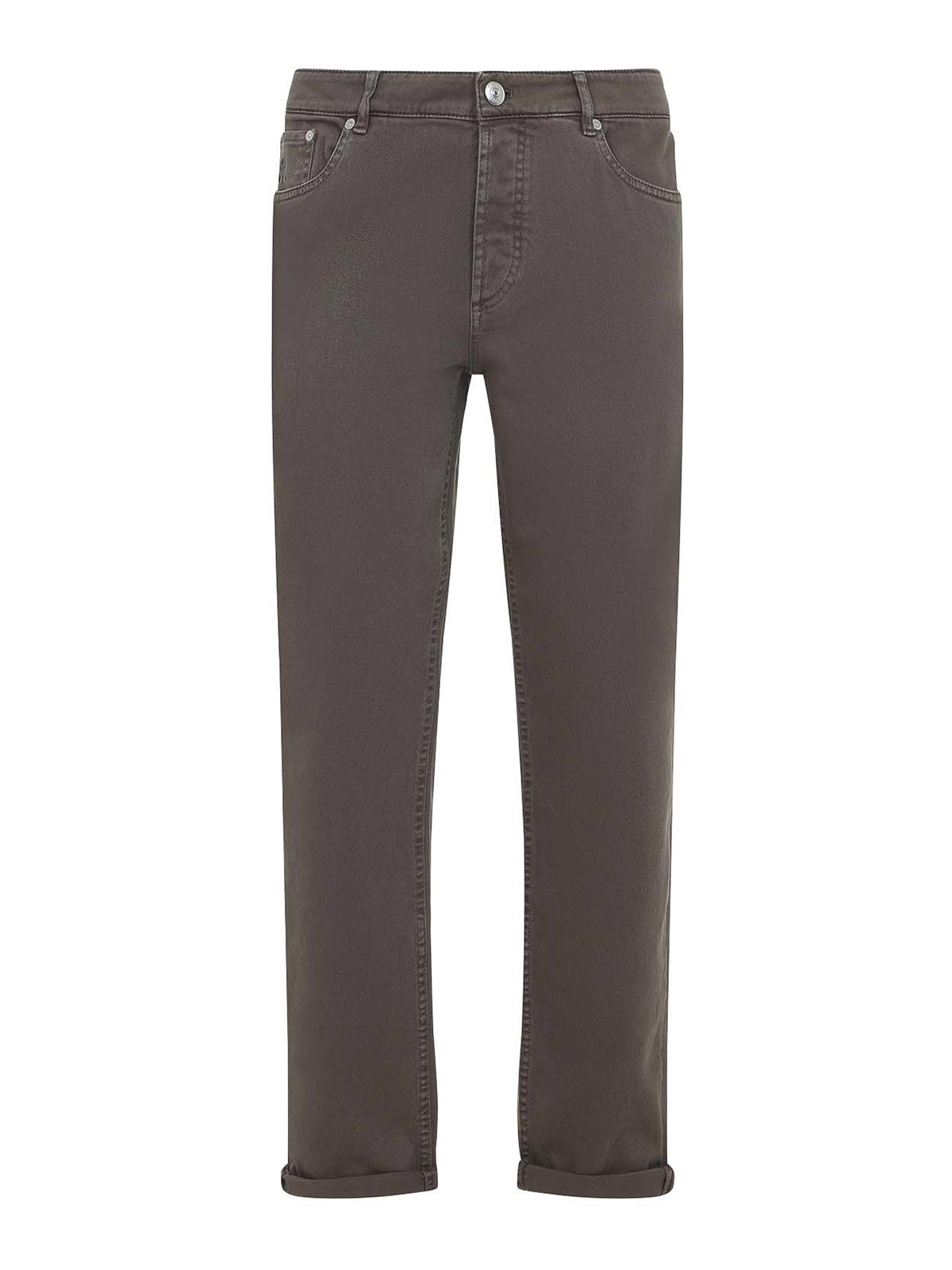 Brunello cucinelli ブラウンコットンジーンズ。ブラウンのストレッチコットンデニム製、ミッドウエスト、ベルトループ、5ポケットデザイン、フロントロゴディテール、ボタンとフライジッパー、バックウエストにロゴ入りレザーラベル、ストレートレッグ。