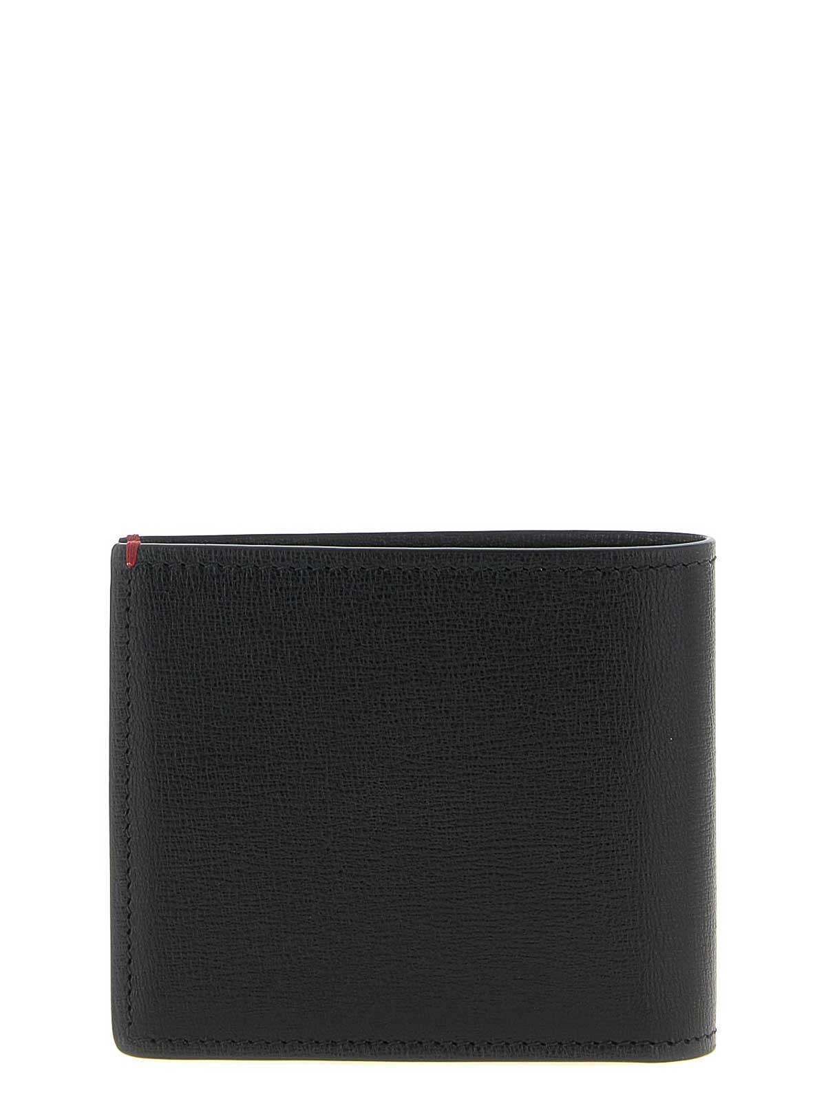 きめの細かいヤギ革の財布、前面にエンボス加工されたソロメオロゴの紋章、本の開口部、優れたコントラストステッチ。